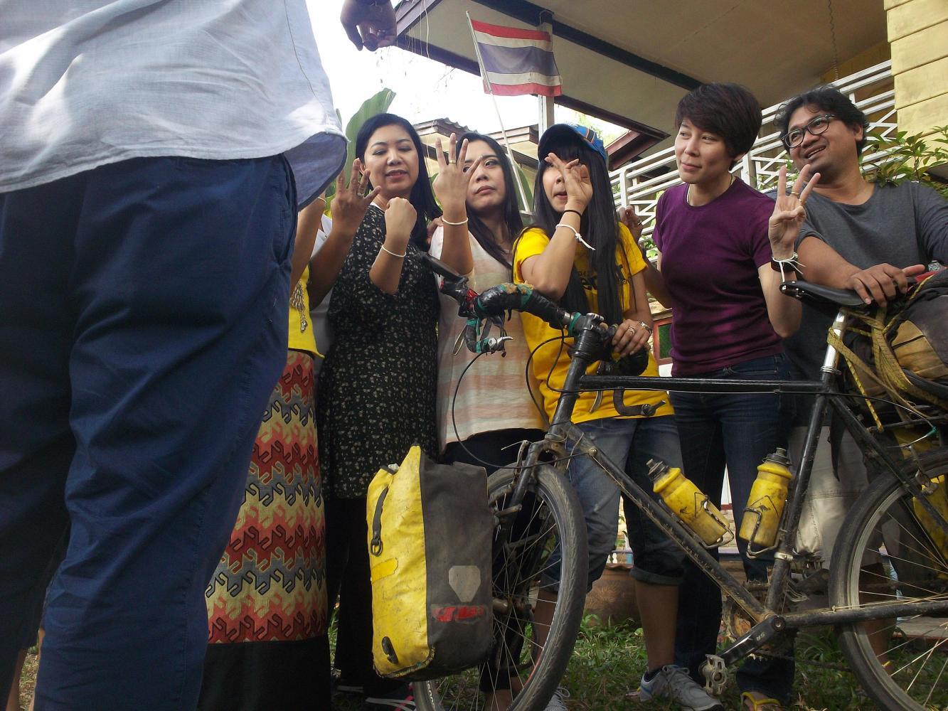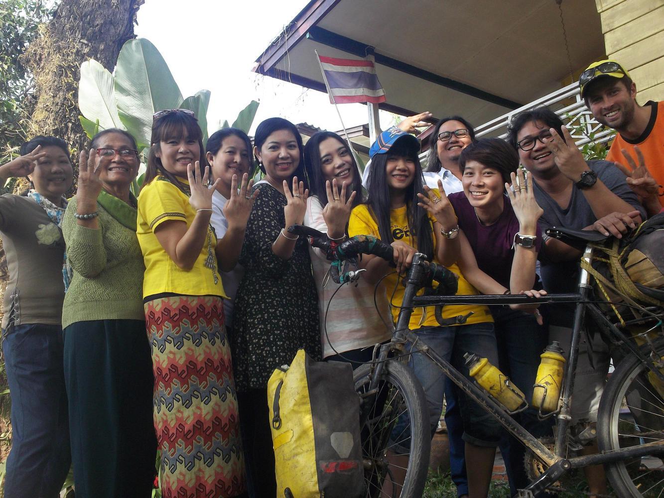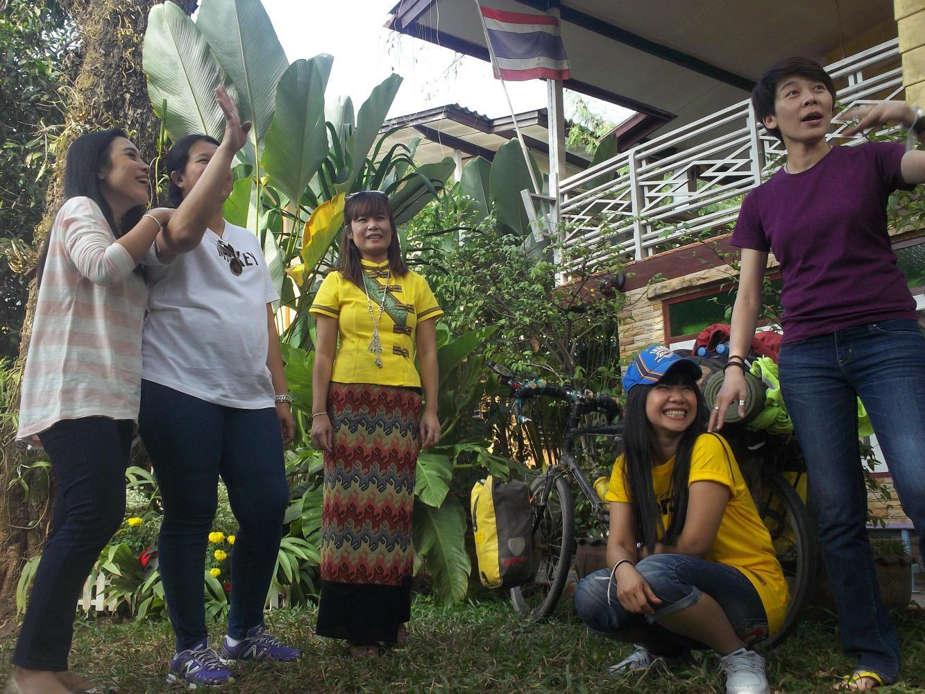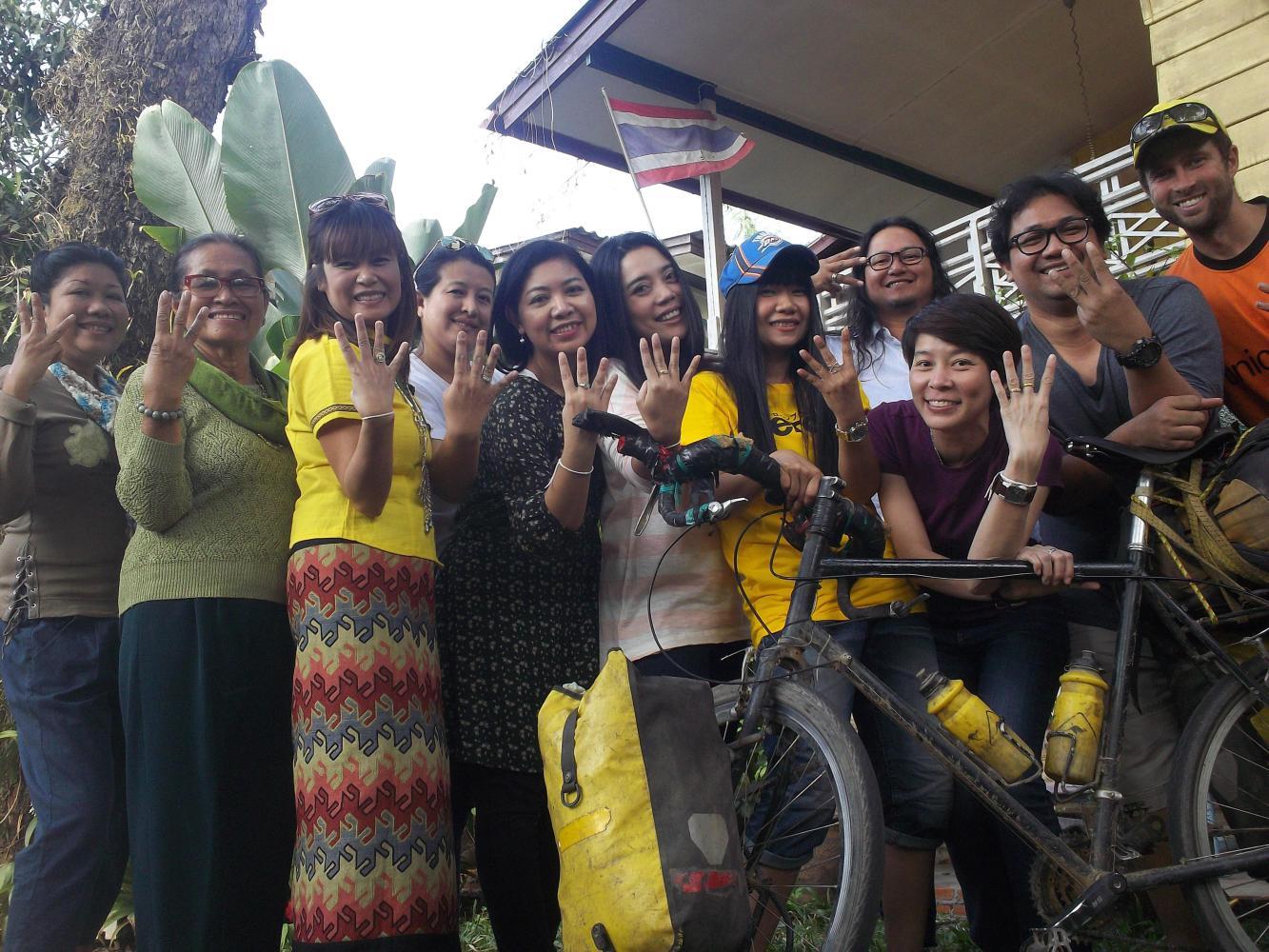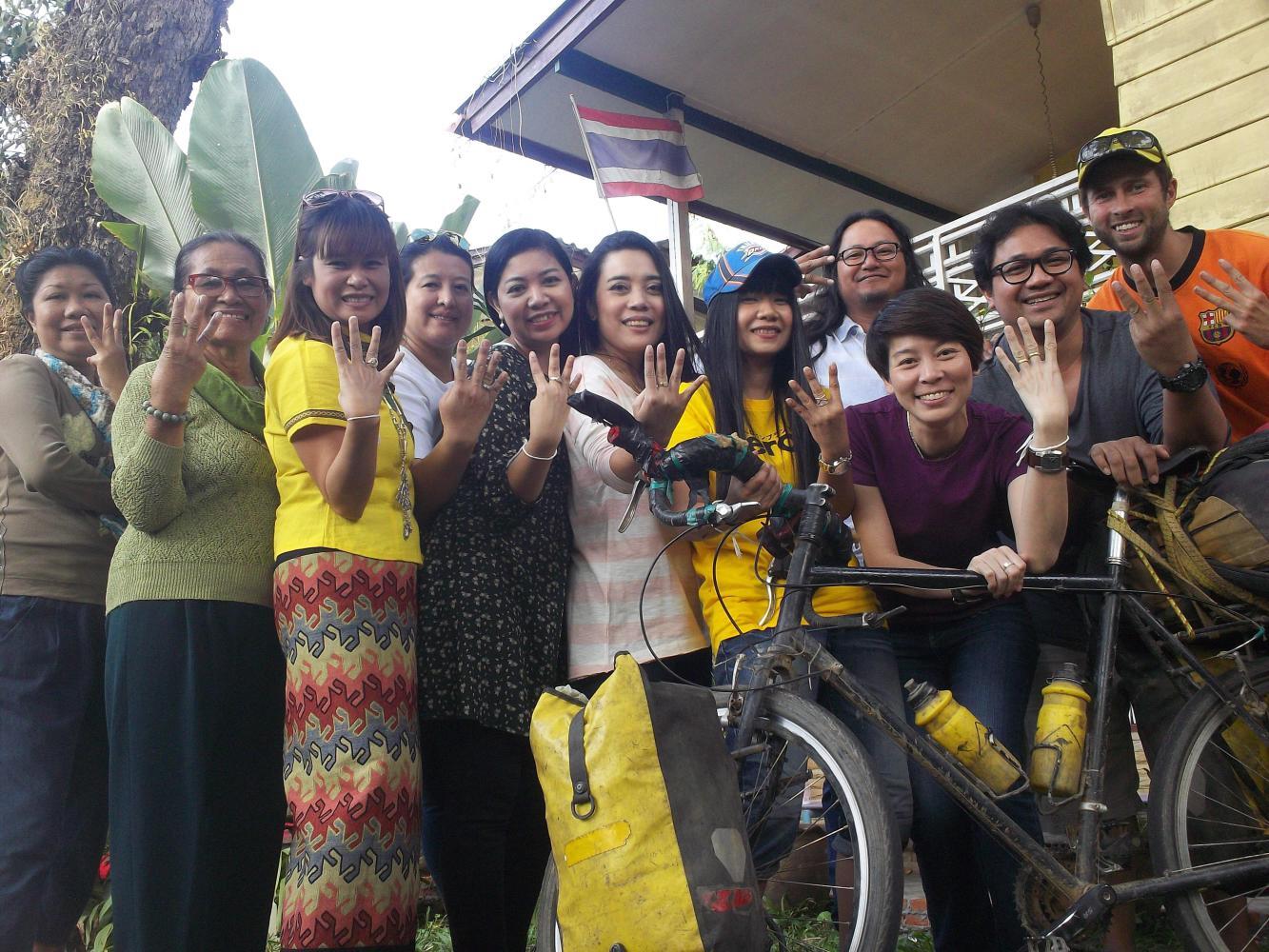 Om worked in Bangkok airport in traffic control, and these women were his colleagues, and they had all come here for some sort of mini-vacation. Because of their job they could all speak some English, and were all very friendly and smiley and fun. 'A' returned from somewhere, and told me he also worked as an air-steward with some of the girls, and that usually none of them were here, so I was lucky to meet them. I told them all about my trip and, seeing a Thai flag on the guesthouse I spotted a unique opportunity to get my country-photo in. Certainly there were 39 fingers available to me here, but could we make it work?