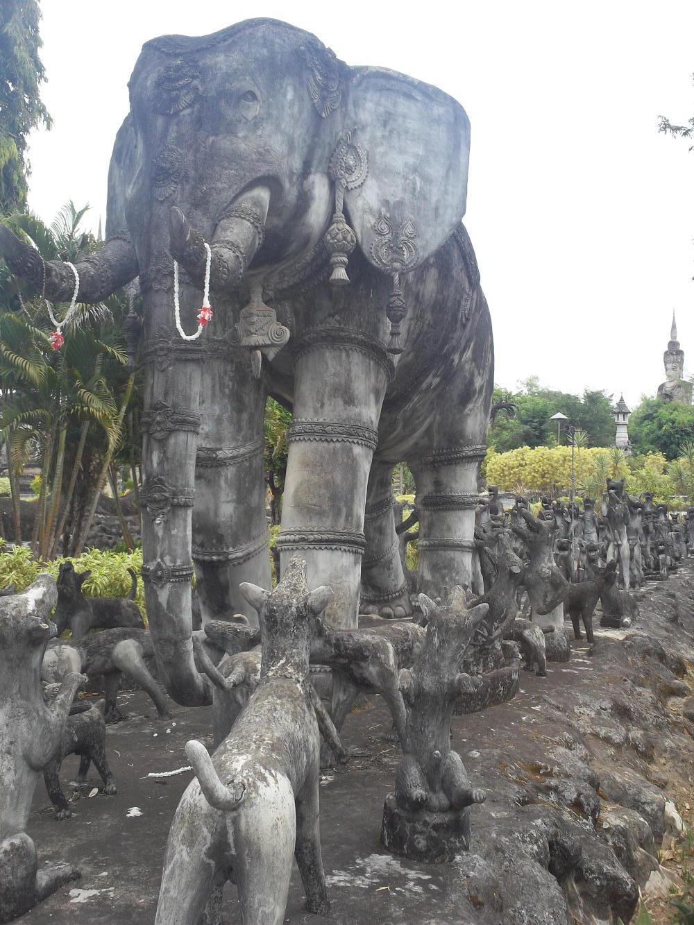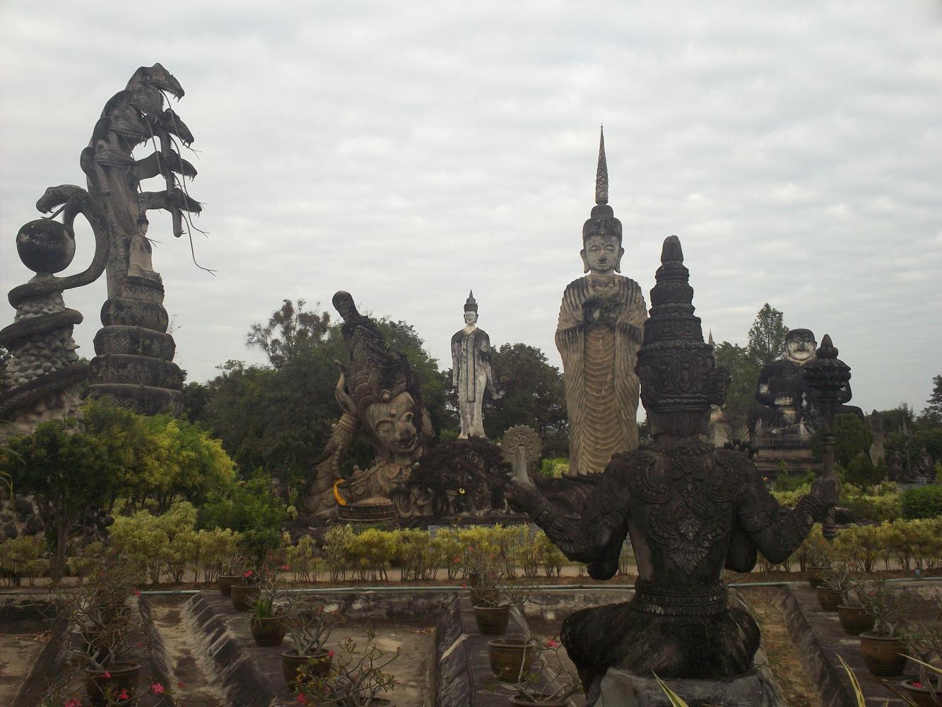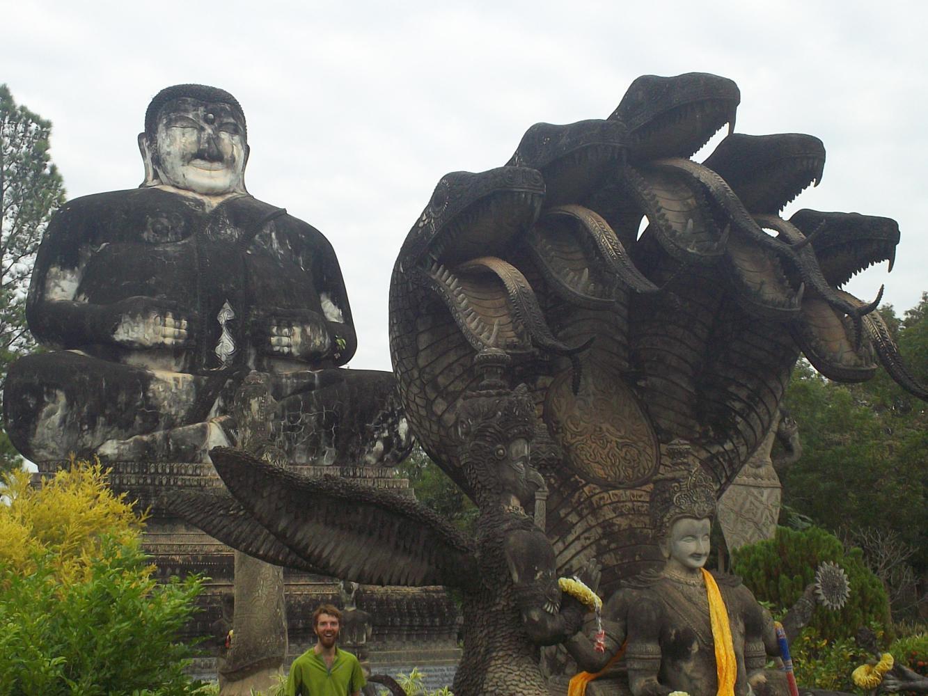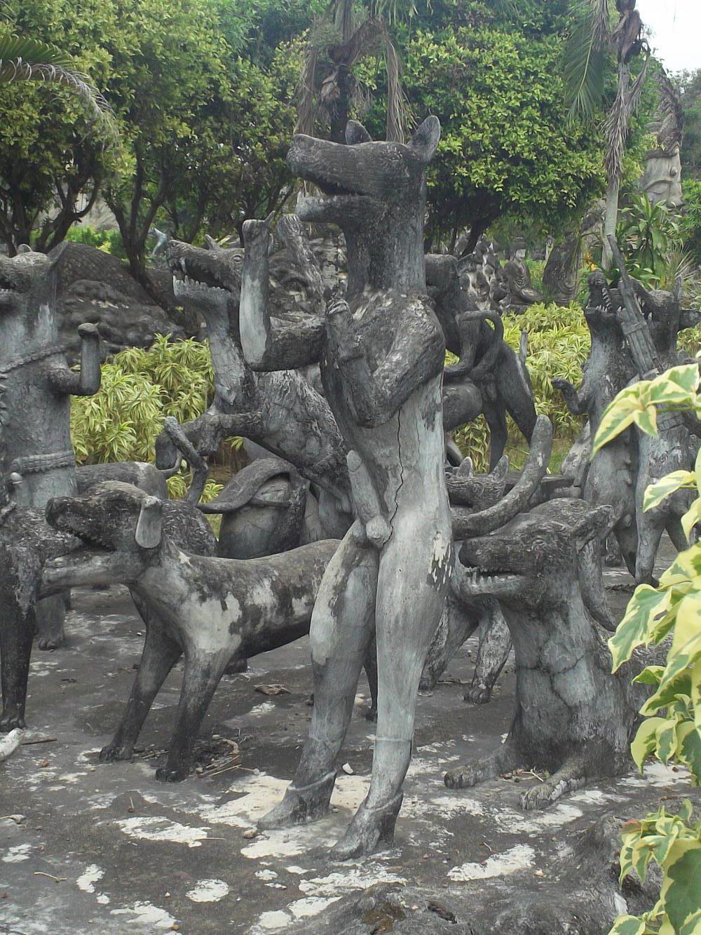 After returning our haul to the guesthouse we wasted no time in springing forth on further adventures, this time heading southeast towards a sculpture park just outside of town. As if concrete slides and Tesco hadn't already made Christmas special enough, this sculpture park brought us to new heights of amazement. The sculptures were huge and numerous, and incredibly interesting. Built in 1978 by someone who thought all religions should learn from one another, it was a mixture of mostly Buddhist and Hindu influences, and included such wonders as giant seven-headed snakes and dogs with big erections: