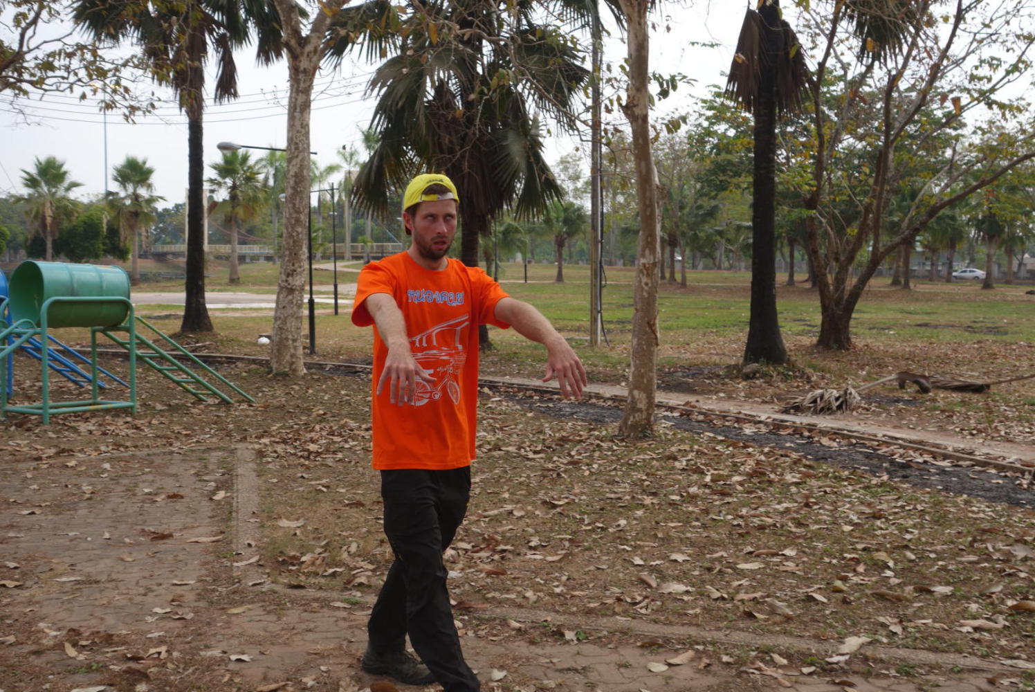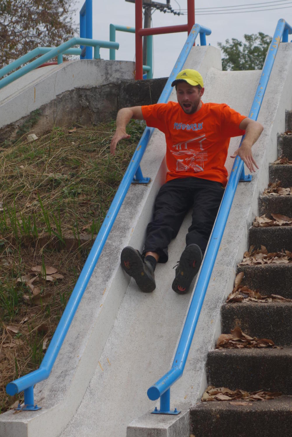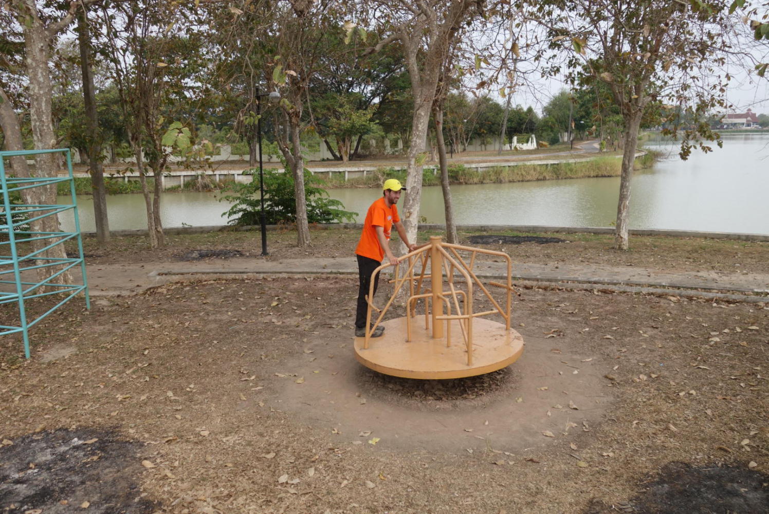 Then we set off on our bicycles for a Christmas adventure. We'd had a look at our map of Nong Khai and decided to explore a couple of the sights that were a little further afield. First up was a park that looked, at least on the map, like it would be a delightful place filled with laughter and joy on this special morning. We cycled along the riverfront to get there, and then briefly explored a Wat, before we arrived at the park. It wasn't at all what we'd expected. There weren't any children laughing and playing, no people at all in fact. The grass was untrimmed and yellowing in the sun, and the big lakes were still and lifeless, no birds swam here. The park was quite big and we cycled around it for a while until we came to a children's playground of rusting equipment. Still there was not a soul in sight. It felt like we were in one of those movies where zombies had killed everyone, and we were the last people alive. On the plus side, there was no queue for the slide!