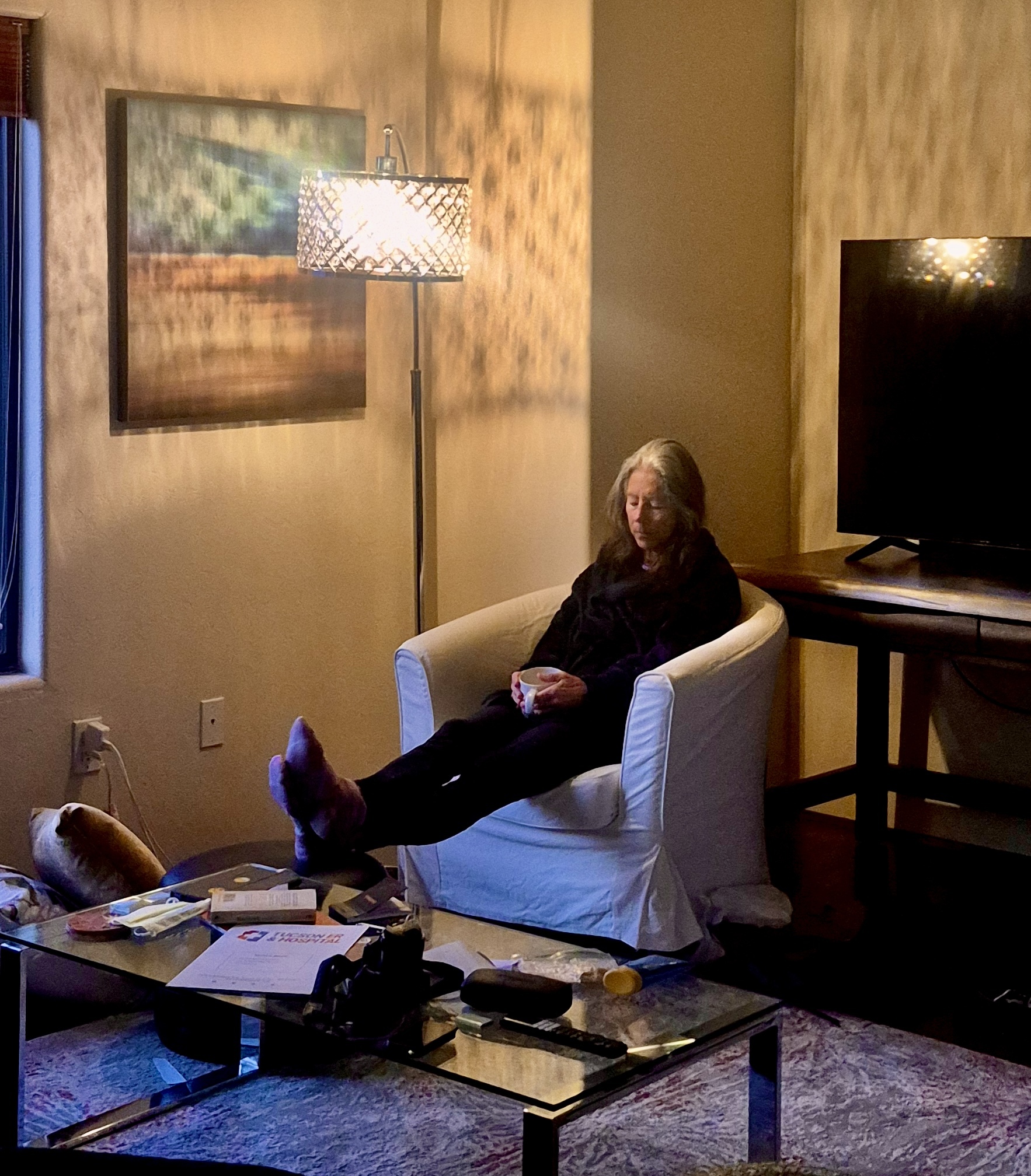 By late morning it's warmed up enough for Rachael and she heads out for her daily constitutional, a shorter walk than usual because it's still pretty cold - it will never get far above 50 today. I have plans for a short ride along the loop, maybe just far enough east to see if there's water in the wash or snow on the peaks, but they never materialize. I find one essential news article after another that just must be read before I go, and eventually I decide I've missed my chance unless I want to risk being late for the main activity of the day, a trip over to The Loft for a viewing of Marty Supreme.