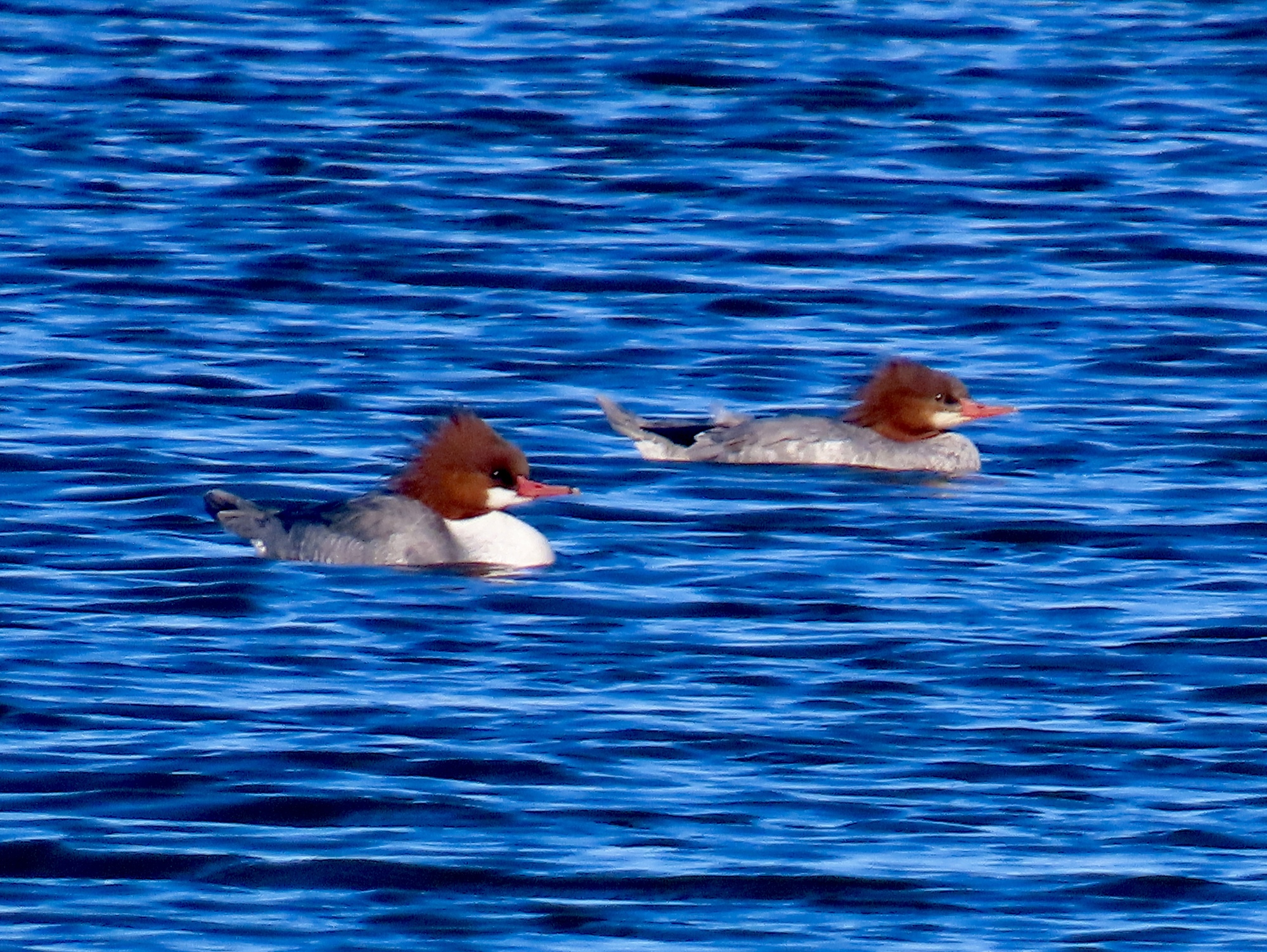 But no, he's just wandering over to chat. He says it's fine to be here if you leave when the golfers start arriving, which will probably happen soon. We chat a bit more, and then I ask if he's seen anything interesting. Yes, there is that group of five mergansers way out there, one of the three birds I was hoping to see today. And there's are a dozen or more tree swallows harvesting insects over the pond, so that's two. And there's a night heron over there in the reeds not far off, which was what I was most hoping to see because it's the one I'm least likely to stumble across back home. Three for three! I'm thrilled.