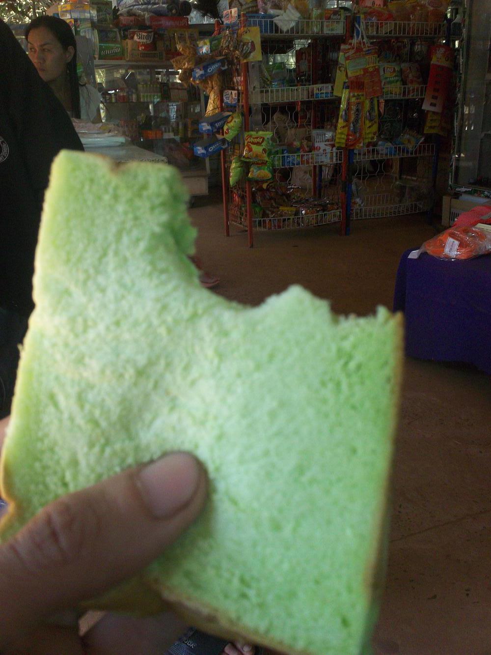 Lon seemed to think that this restaurant could not cater to vegetarians, and so he took me instead to a shop across the road. Here he bought and gave to me three sandwiches wrapped in plastic. I tried to pass them around, but neither Lon or Sing were hungry, or so it seemed. So I just sat down and unwrapped one and inside I found the most peculiar sandwich made of green bread, with a filling of a mysterious green gloopy goo. It was a quite spectacular lunch.
