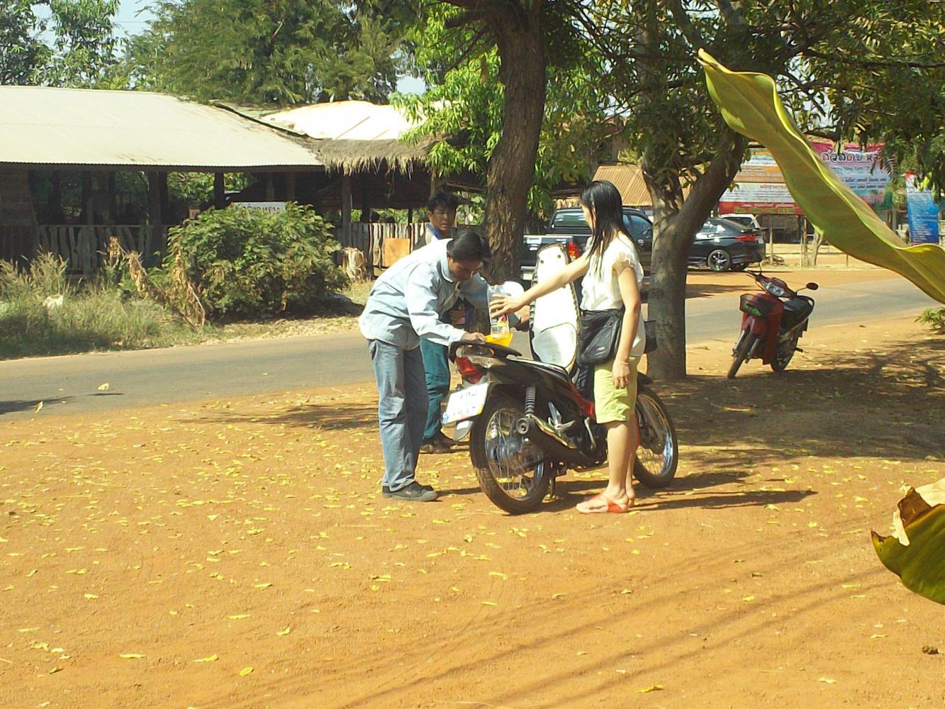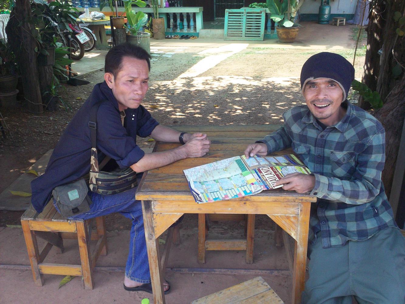 Two kilometres later I located the two men again, and they invited me to sit with them at a table outside a restaurant. It was a slightly strange arrangement, because the table really was outside the restaurant, in fact it was on the other side of the street, and it seemed to be blocking someone's driveway. I fetched a piece of paper from my bags, on which I had got someone to write in Thai about my being vegetarian, and showed it to the man, whose name was Lon. Lon seemed to think this meant that I couldn't eat noodles, and the word 'salad' was mentioned instead, which was just fine by me.