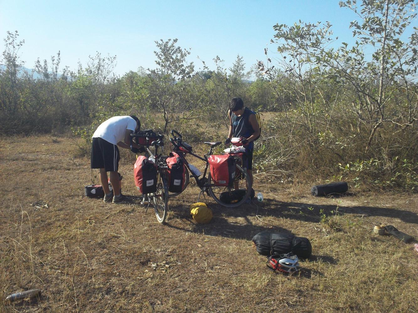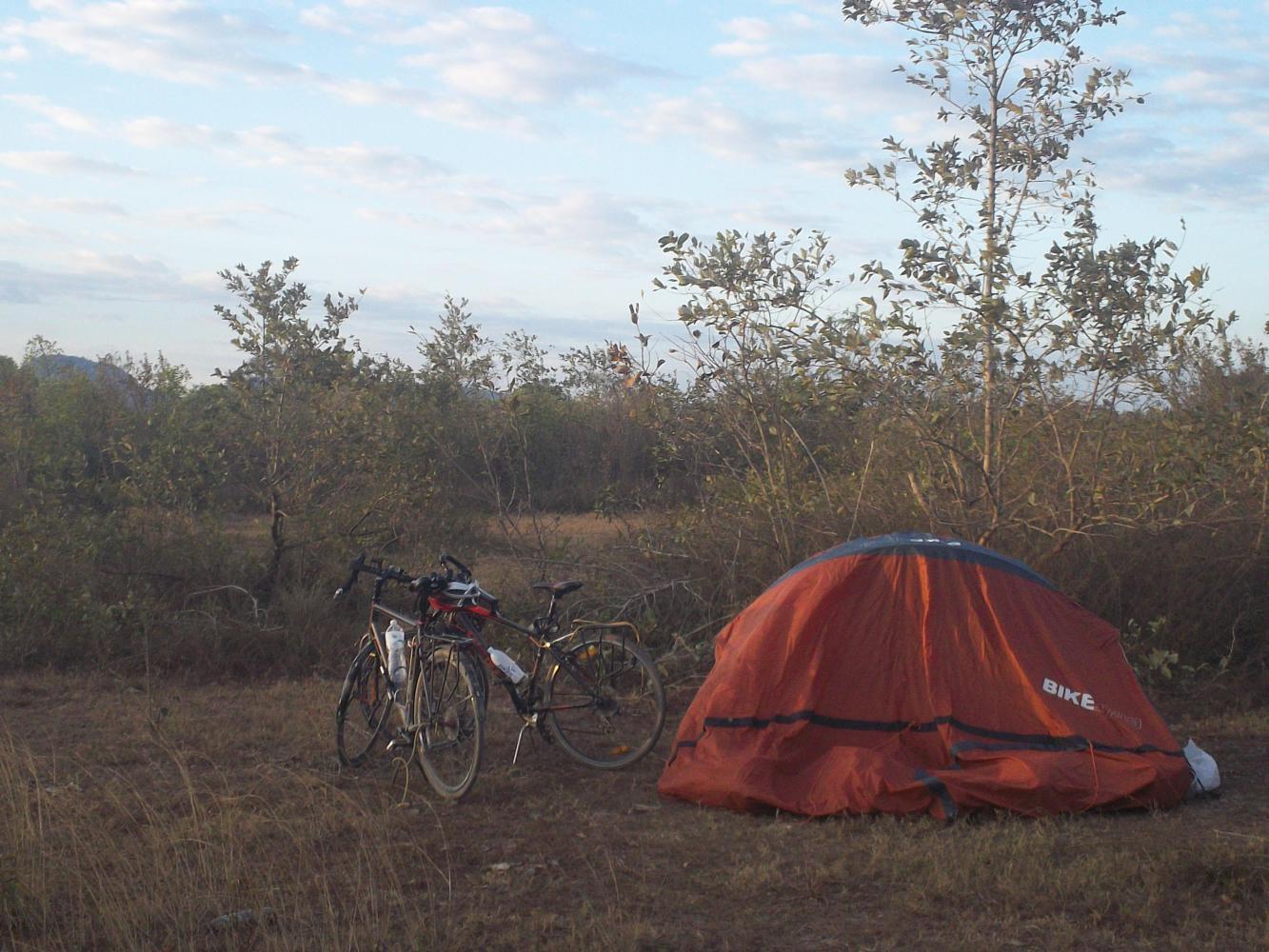 For two people that wanted to cycle 130 kilometres Jin and Lee were certainly taking their time about getting started. As usual I'd woken as soon as daylight hit my tent - an automatic bodily reaction fine-tuned by years of wild camping in places where I sometimes shouldn't. Knowing that we were in a safe place this time, and that my own cycling ambitions for the day didn't exceed the ten kilometres to Pakse, I allowed myself an hour of snooze before leisurely getting up and taking down the tent. I had expected to see the Koreans up bright and early, keen to make headway and get some good distance in before the heat of the day, but there was not a peep from their red tent. I guessed that they just fancied a little extra sleep and so I sat and waited and did nothing. Finally at about nine o'clock Jin emerged and, wiping the sleep from his eyes, said "it's too late to cycle to Four Thousand Islands today, we'll just take the bus."