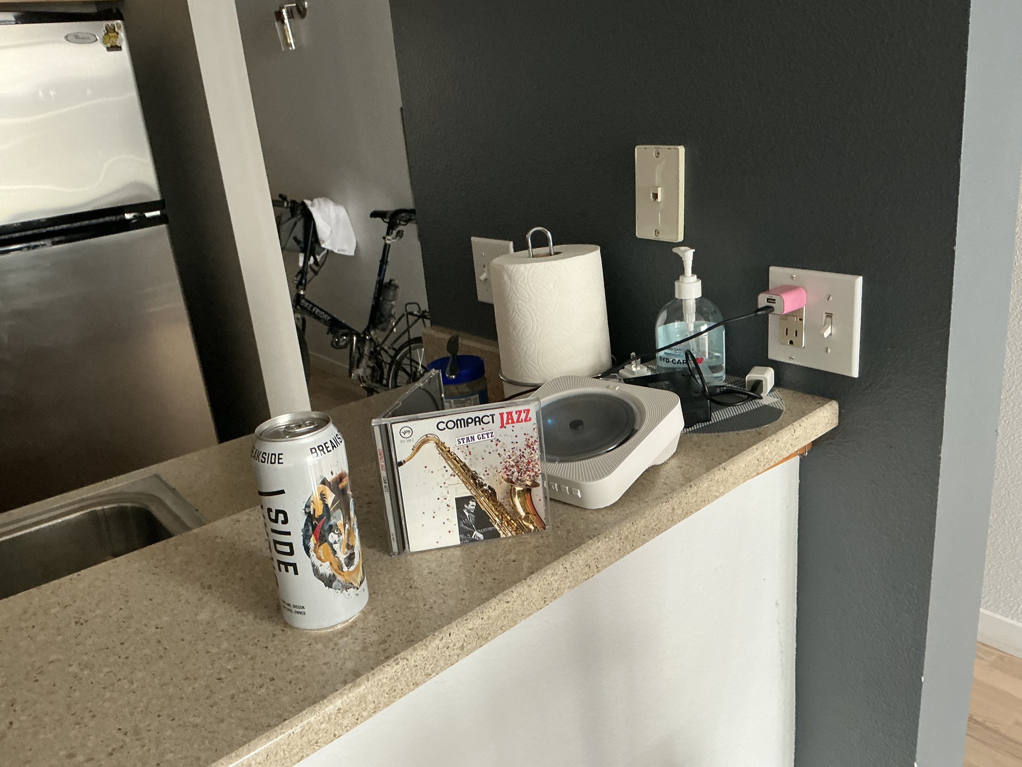 I was really excited about being able to bike to the coffee shop this morning rather than drive there - it's a pain backing out of and back into our tight parking spot, and there's always a question of whether I can find a parking spot close to the cafe (and yes, I know I should apply for a temporary disability parking permit). Now I can just wheel the bike out the door, use it as a saker down our long hall, and then bike right up to the front door of the cafe.