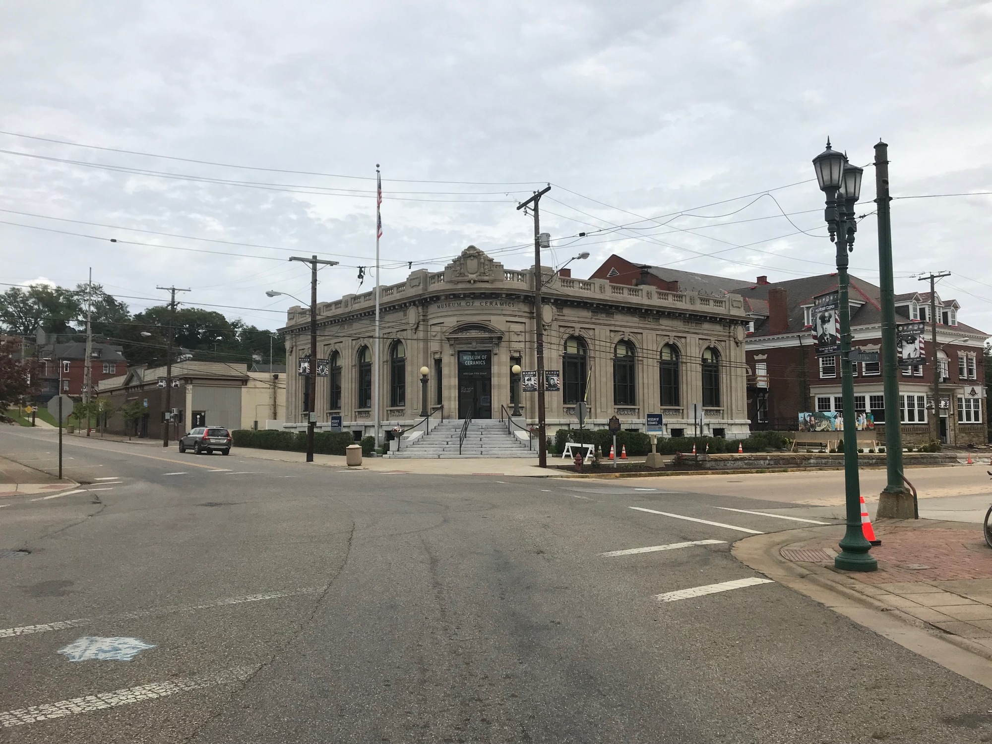 Once in town, I headed on Broadway to the Museum of Ceramics. From the outside, the beautiful building occupies a wedge-shaped corner and flanks out to the sides on either direction from its front entrance apex. Unfortunately, it was closed by the time I got there. I'll have to go back someday for the tour. At one time, East Liverpool was considered to be the pottery capital of the United States. The museum houses an old potter's wheel, some distinctive pieces, and even jewelry made from the glass. The tour gives a good look at some of the industrial history of the area. This whole area along the Ohio River had furnaces and shops where glass and ceramics production were a big industry in the late 19th and early 20th centuries.