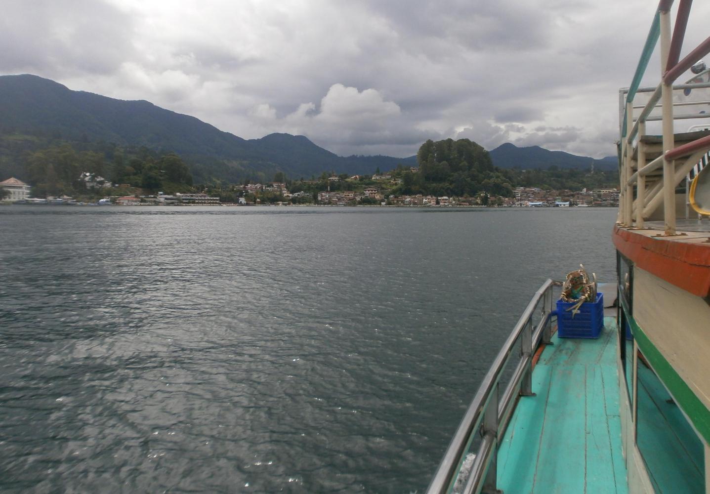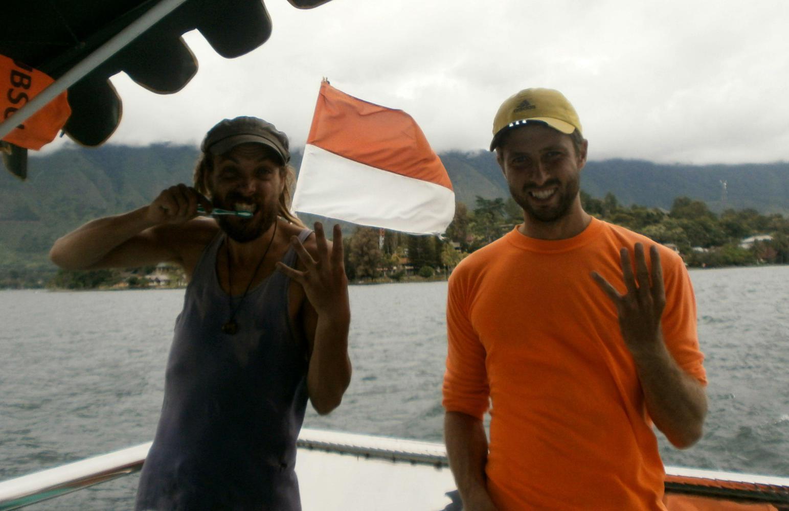 We planned to leave our little piece of paradise on the 13th, which would give us an extra day to get to Medan, but when it came to leaving Tom and I looked at each other and said “Nah” and so we stayed another day. It was lucky that we did, because on the afternoon of the 13th I got really quite sick and wouldn’t have been much good at cycling. Come the next morning and I was still feeling a bit crook, but not as bad, and we really did have to get going. There was a scheduled ferry leaving Tuk-Tuk for the mainland at 9.30 a.m. but getting Tom ready for it proved difficult and it was a rush to get down to the port on time. We did make it though, and as we sailed away I saw that on the back of the boat there was an Indonesian flag blowing in the wind and an opportunity for me to get my country-photo in, although the photo does rather give away Tom’s lack of organisational skills: