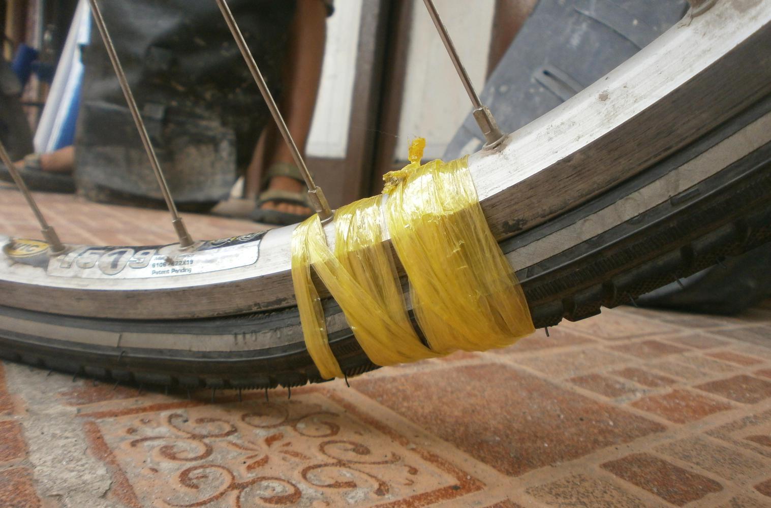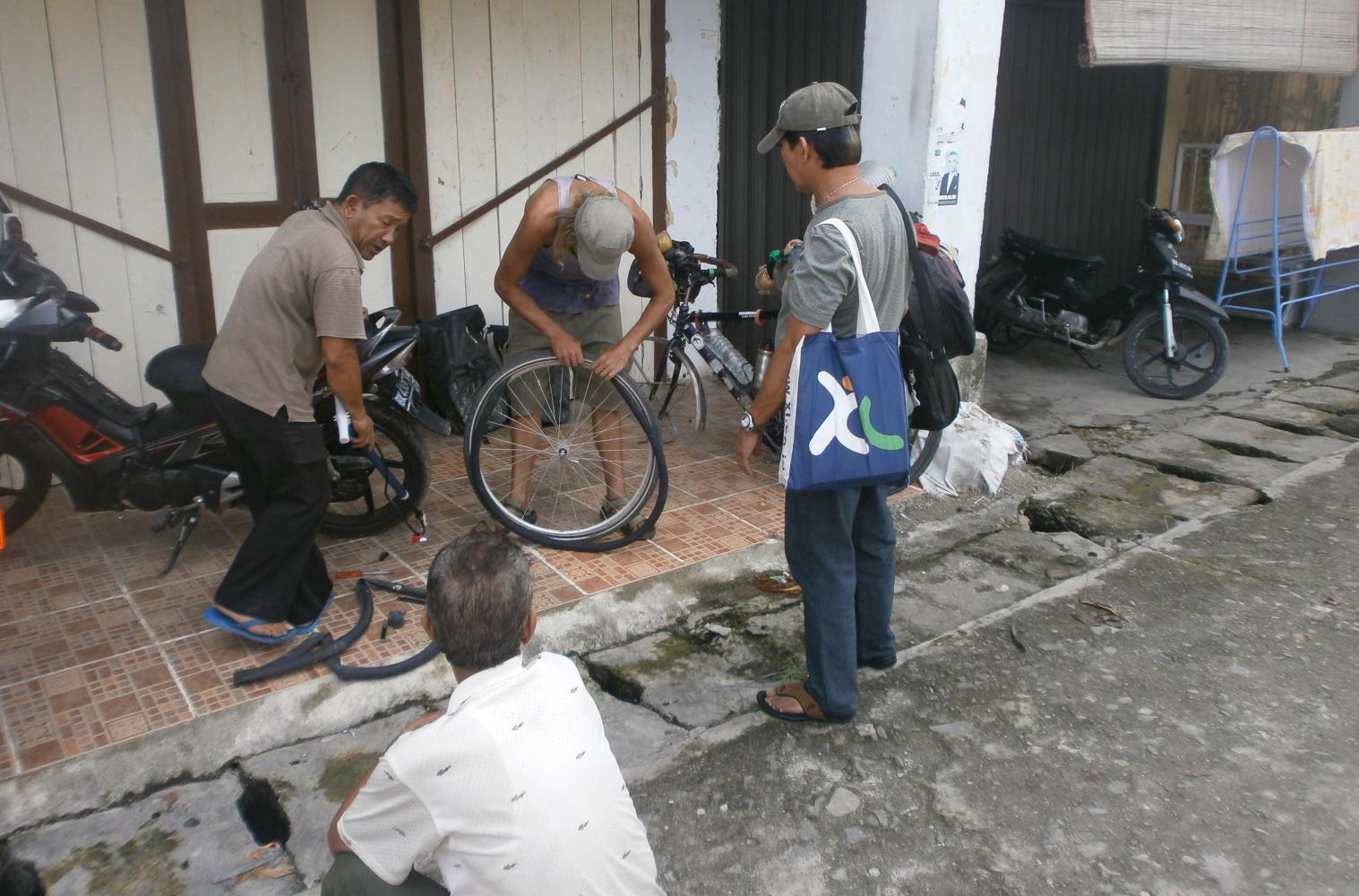 Tom borrowed the shop’s bike pump in order to put some more air in the tube. A moment later I heard the sound of air escaping very quickly and saw Tom holding up a piece of the valve which he had somehow managed to break. Now he was really screwed as of course he still had no spare tube and this one was obviously done for. He started talking about having to hitch-hike now, which would at least let me get on and start cycling and give me the chance to get to Berastagi in time to climb the volcano without having to keep waiting for him. But then by some miracle the shop turned up with a 28” tube. With the tube replaced a man then provided Tom with a long strip of plastic that he wrapped around the problem part of the tyre in order to hold it together. He was suddenly back in business.
