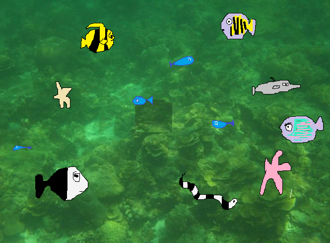 The snorkelling was really great. There was a lot of coral just off the beach and brightly coloured fish were in abundance. I didn’t have a waterproof camera of course, and, after ruining my last camera whilst snorkelling in Koh Lipe, this time I didn’t even risk taking it off the ship, which explains the lack of photos of Gili Nanggu. Don’t worry though, a lot of the fish were the same, so I’ll just recycle an old image. The main difference this time was the absence of that pink and grey one that swam towards me in Koh Lipe, and this time there were lots of electric blue little guys. Here’s a very accurate interpretation of what I saw:
