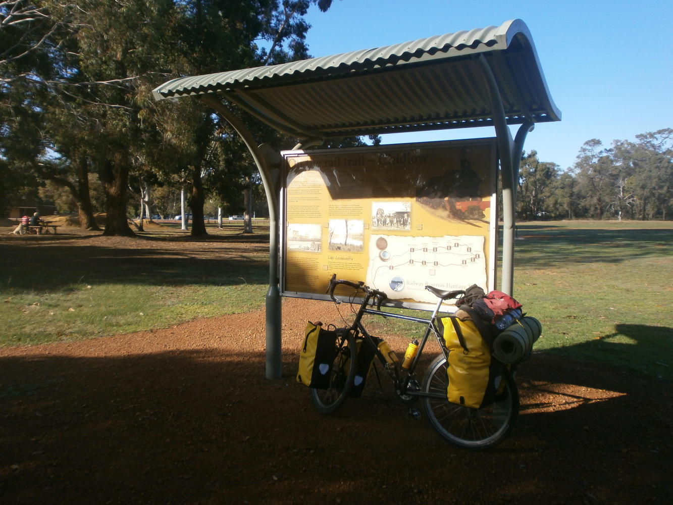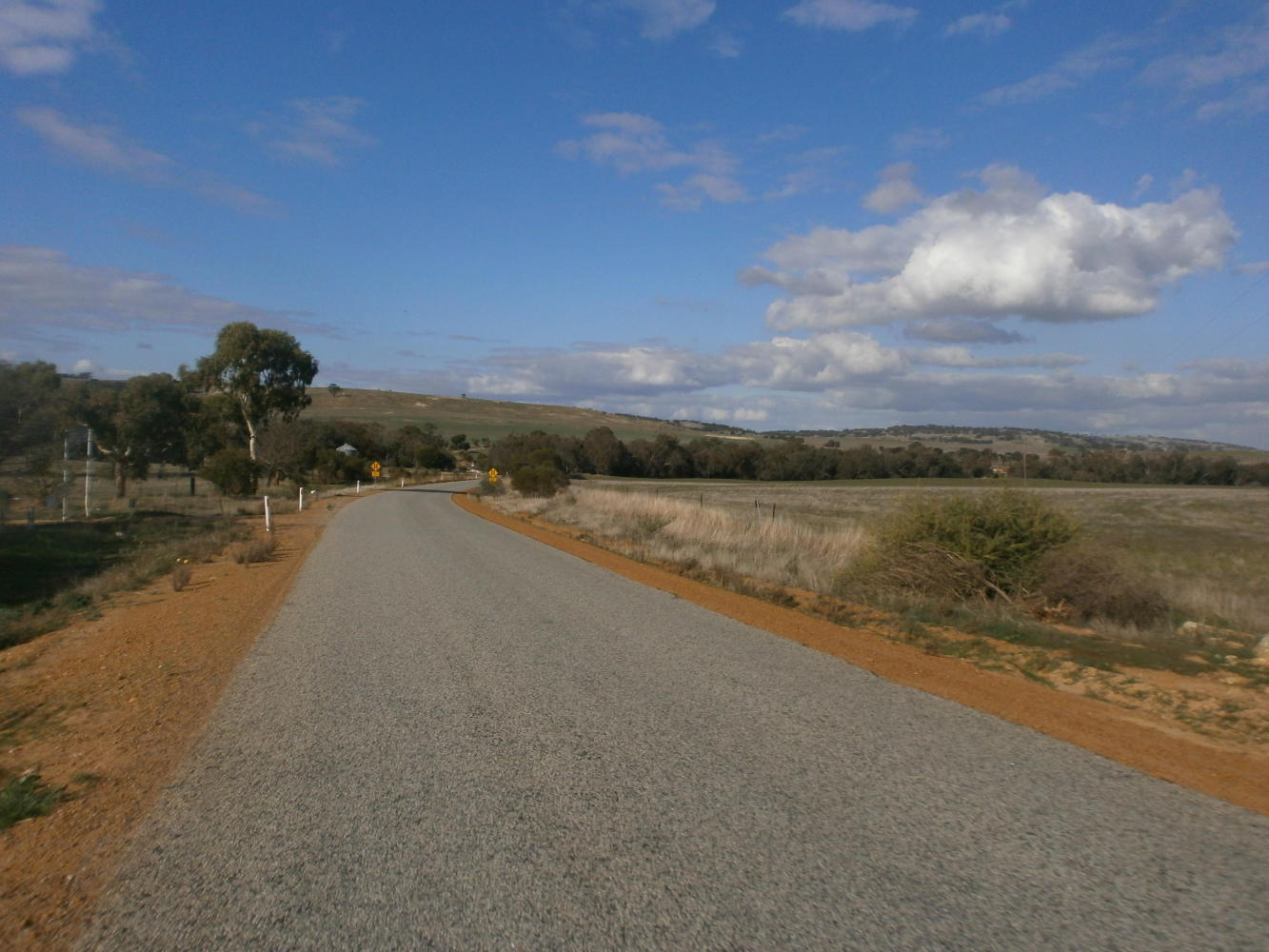 Then after ten kilometres I came to a right turn onto what I thought, from Rich’s map, was going to be a fairly big road. I was a bit surprised to instead find a dirt road with a washboard surface and no traffic, surrounded by wild scrubland, and no hint that there was any human habitation anywhere nearby. I hadn’t been expecting this. It felt like I was already way out in the Australian outback, and there certainly weren’t any cyclists stopping to talk to me anymore. In fact I didn’t see anyone for the next 60 or 70 kilometres as I made my way south-east towards the town of Beverly. Fortunately, however, the road did become paved soon after the turn, and my belief that I had already reached the remote outback turned out to not quite be true, as fields of wheat and sheep began to appear. I didn’t see any live kangaroos, but I did see lots and lots of green parrot-like birds. They were everywhere, flying between the trees that lined the peaceful road, and the cycling remained really quite lovely as I pushed on towards my goal of 120 kilometres for the day.