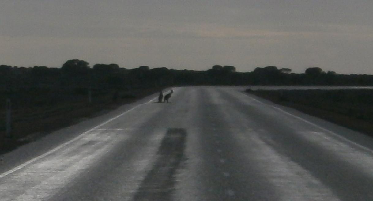 I was making good progress and was determined to make it to 140 kilometres. I knew that if I could make it to such a distance having had to trudge into that awful headwind all day that it would be a key turning point, a sure confirmation that I was going to be able to make this deadline. And the distance quickly disappeared behind me, until with just ten kilometres to go I entered an area of trees, with woodland appearing on both sides of the road. Then two kangaroos hopped across the road just in front of me. A minute later two more did the same, from left to right. I slowed down, increased the volume of my shouting. More darted across. Another three, then two more. Suddenly they were everywhere, all going across the same way, left to right, like some giant migration. I was sure that they were passing behind me too. I was stuck in the middle of a herd off flipping kangaroos and I was terrified. I knew if they hit me it was going to hurt. I wanted to stop, but I had nowhere to go. Even if I ended the day now, short of my target, I’d still have to try and put up my tent in a wood of flying kangaroos. Two more. It was surreal. The most crazy experience of my life. I dodged a fresh roadkill. Then another, much more alive one, leaped out just in front of me. “Stay away kangaroos!” I cried out desperately, foolishly. I knew I’d said I wanted to see kangaroos, but this was too much! But I had no choice other than to keep going, more kangaroos flying out of the darkness at me. This was insane.