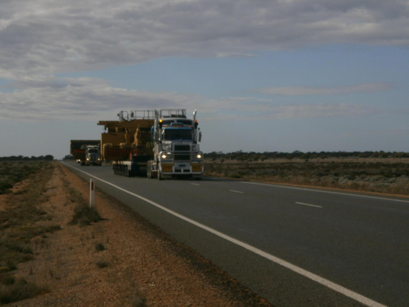 It began, of course, as a depressing slog, but soon I saw something that lifted my spirits enormously. As I crawled desperately along into the wind I looked up to see a kangaroo, some hundred metres ahead of me, hopping across the road. Two others soon followed, and these paused in the road itself long enough for me to take a photo, before all three of them bounded off across the plains. They were extremely fast, reaching the horizon in no time at all, and it was a joy to finally see these wonderful creatures for the first time. For a few minutes I had a grin from ear to ear at having seen them.
