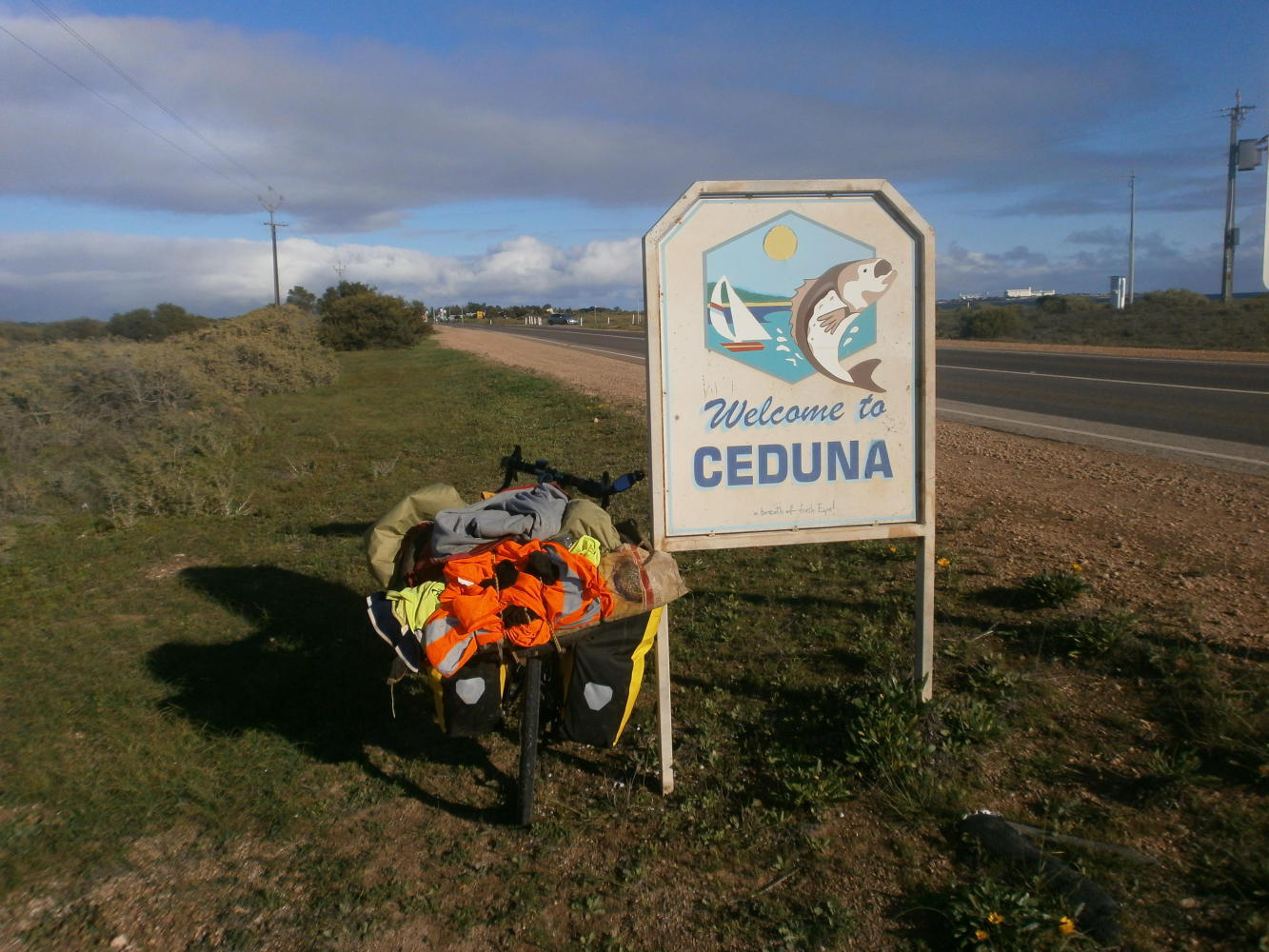 The Nullarbor wasn’t ready to let me go easily. Another strong headwind greeted me on the morning of the 24th of June, a headwind that only grew more intense and more angry the closer that I got to my finish line of Ceduna. I should not have been so surprised, but I battled on into it regardless, because Ceduna was a proper town, with a supermarket, and I couldn’t wait to get there. Yes, my excessive food stores had just about carried me the whole way from Norseman, with my bike gradually shrinking in size and getting lighter as I went, but I’d eaten all the good stuff first, and for the last day and a half I’d been surviving on handfuls of honey-puffed-wheat. Just before the town I came to a fruit-fly check-point where all fresh fruits and vegetables had to be declared and confiscated. Rolling up to the stop line a man came out to ask if I had any such items on me. I shook my head: “I haven’t seen any fresh food for about a week mate.”