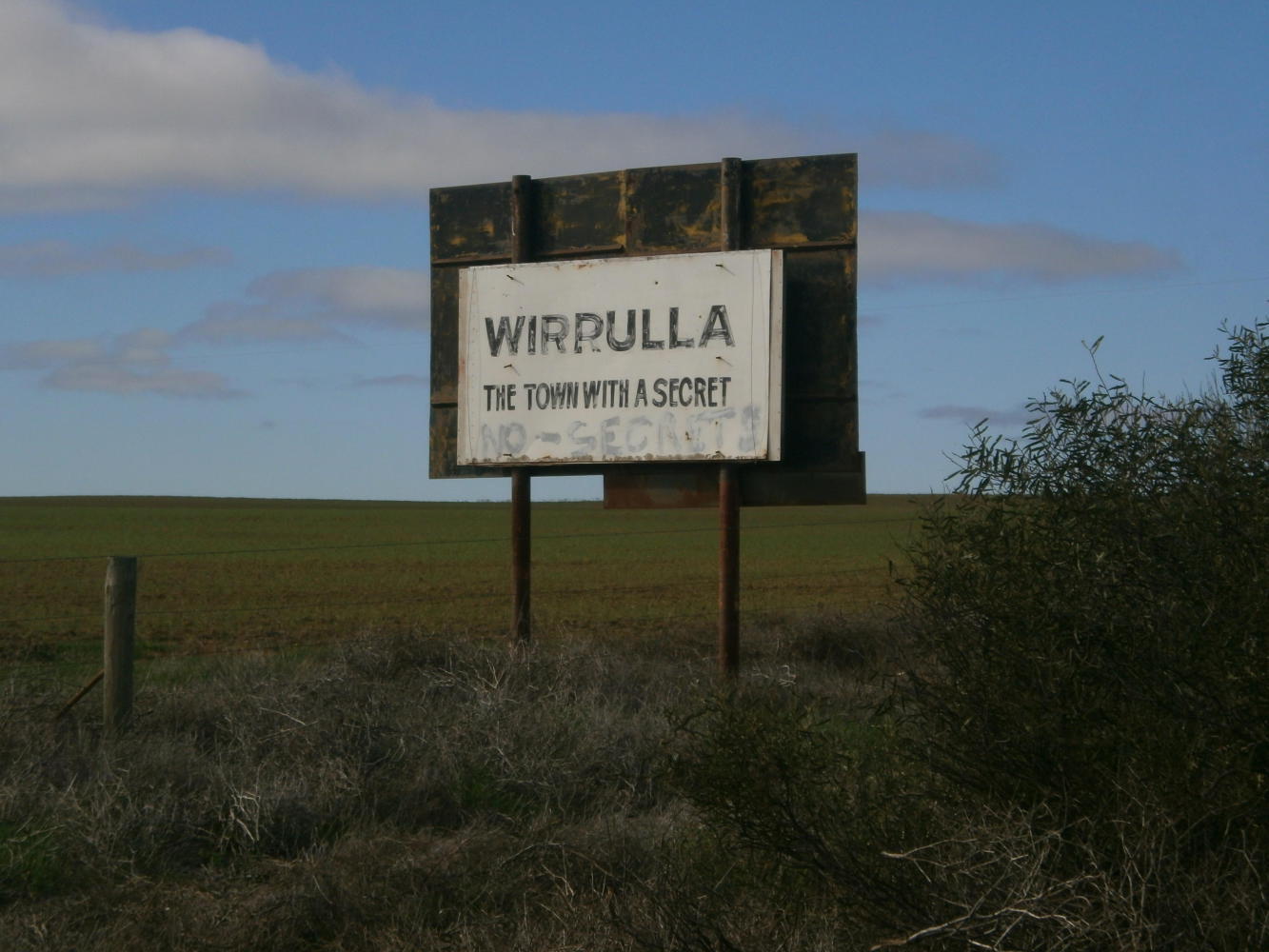 If I’d thought that reaching Ceduna would bring about a return to civilization (and I did), then I was wrong. The next day I found myself cycling on an even emptier road, through land that, even though it had a bit of wheat agriculture on it, was every bit as unpopulated as the Nullarbor had been. Reaching the next town of Wirrula was the only thing that kept me focused against the tedium of yet more boring cycling. For hours I looked forward to reaching it as the day dragged on. Then, as I drew close, I saw signs saying ‘Welcome to Wirrula – the town with a secret’ and I got even more excited about what that secret might be. But then I finally arrived at Wirrula and I found out that the secret was that there was nobody there. It was a tiny little hamlet consisting of a few houses, a pub, and a row of large wheat grain silos. The only street was empty. I wandered into the pub. Nobody there. Not a soul in sight. Just a row of empty stools pulled up at the bar. I wandered back out into the empty street. I guess I’d just have to keep going to the next town of Wudinna. Maybe there’d be somebody there. And it was only another 120 kilometres.