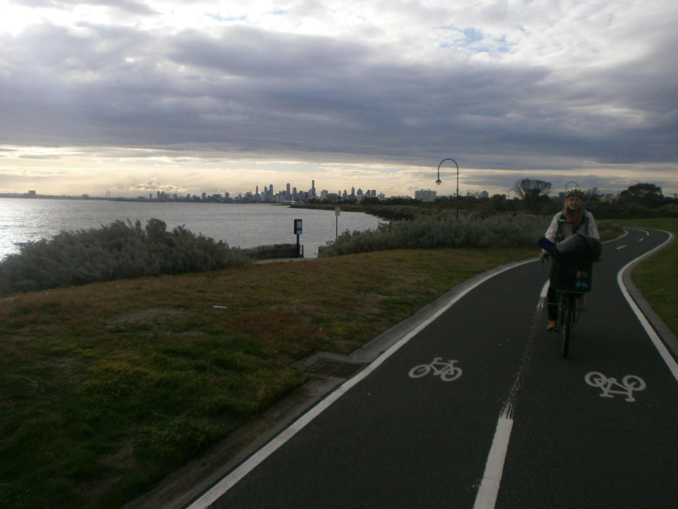 This did give us a chance to ride bikes together again, and to see some of the city of Melbourne on the way through. With its trams and coffee shop culture and Aldi stores, Melbourne is probably the most European city in Australia, and it looked interesting enough to me. A good mix of tower blocks and modern art, graffiti and bicycle lanes, and streets bustling with life. Not that we had much time to stop anywhere, other than at another bike shop in St Kilda, where we ticked another box as Dea picked up her new Ortlieb panniers. From there we hit a bike lane which followed the shoreline of the bay for a good twenty kilometres or so. It was lovely cycling as the skyscrapers of the city centre once again disappeared into the distance and just for a while it was magical to be cycling with my girl again.