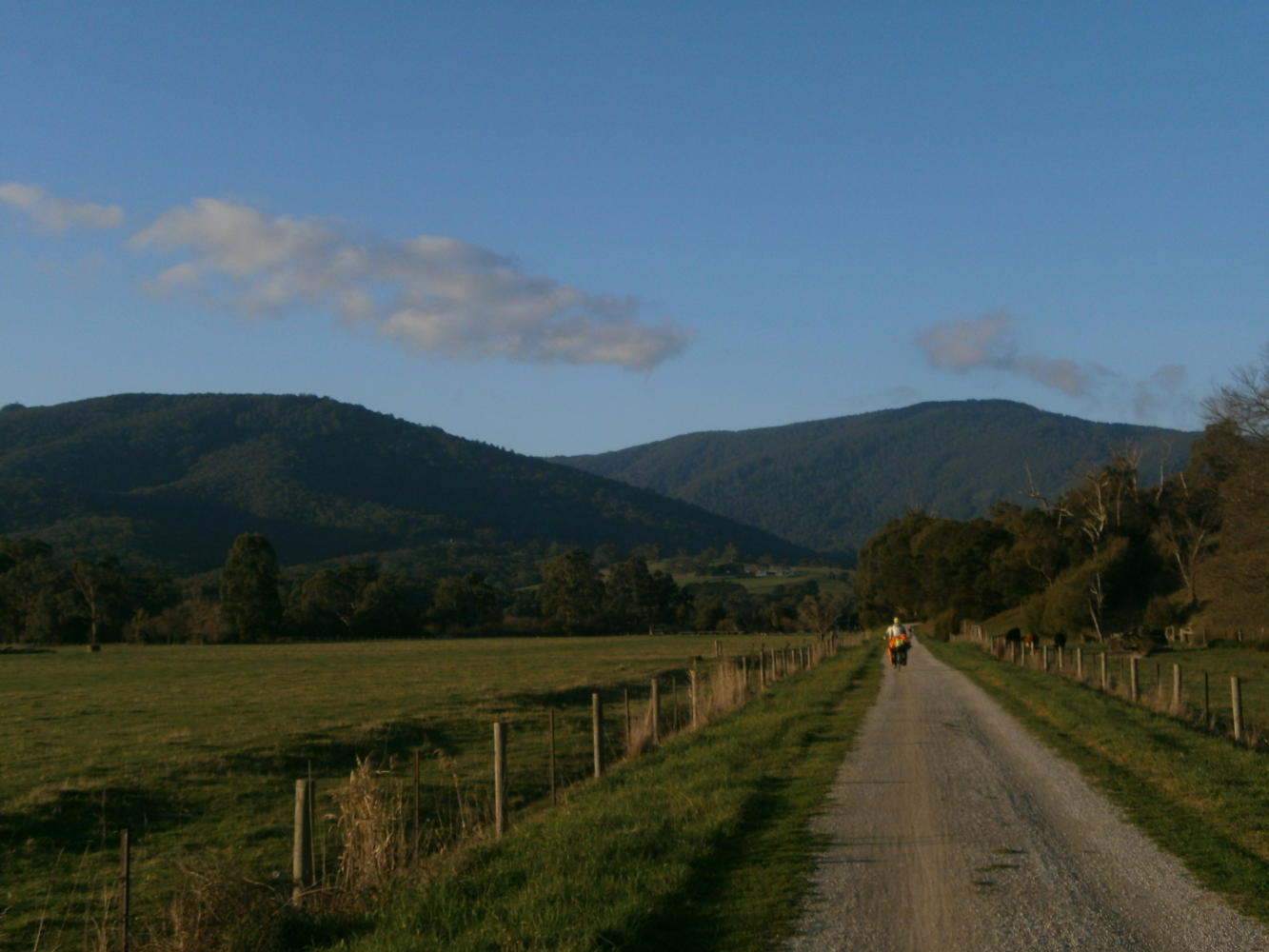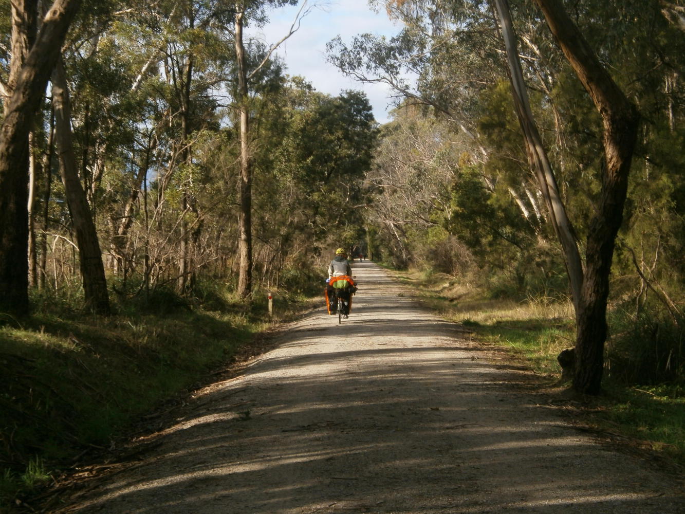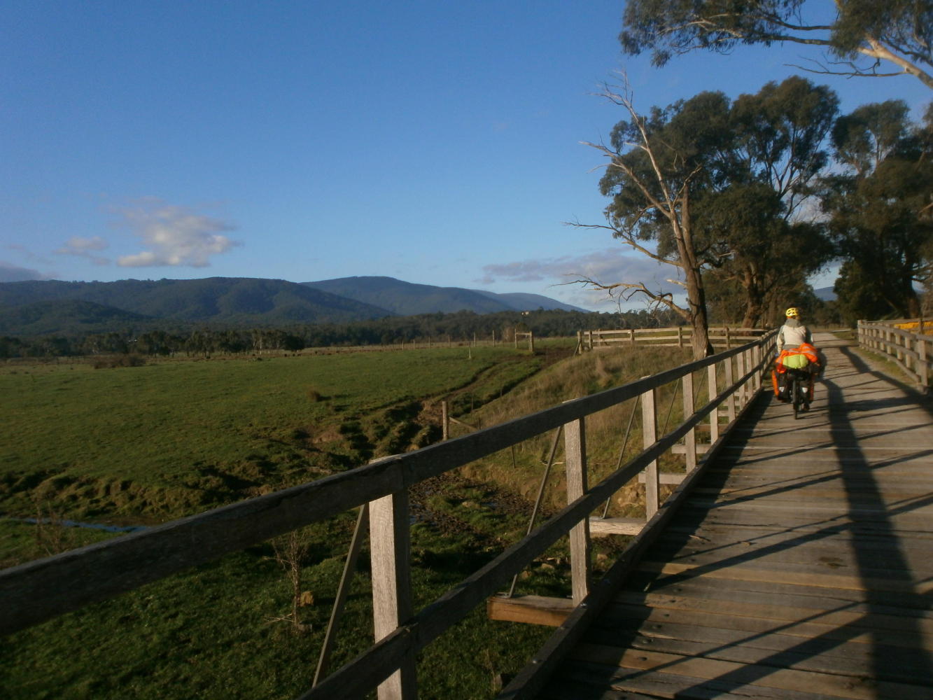 I did another double take in the morning. Back in the familiar surroundings of the tent it was even more of a shock to wake up and see such a beautiful face lying next to me. After so many months of waiting, we were finally together on the road, making our dreams come true. It was hard to believe. And it was much nicer weather too, a cool and clear morning, just perfect for a visit to BigW. And then there were more trails to be navigated and some small roads too, until finally, after a day and a half, we got out of Melbourne on the rail trail to Warburton.