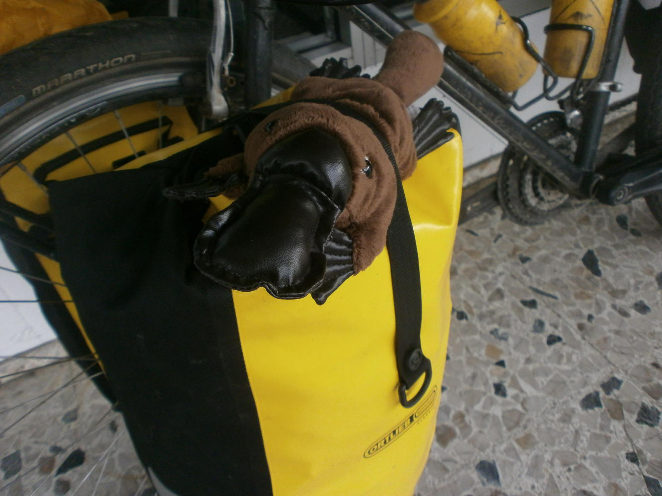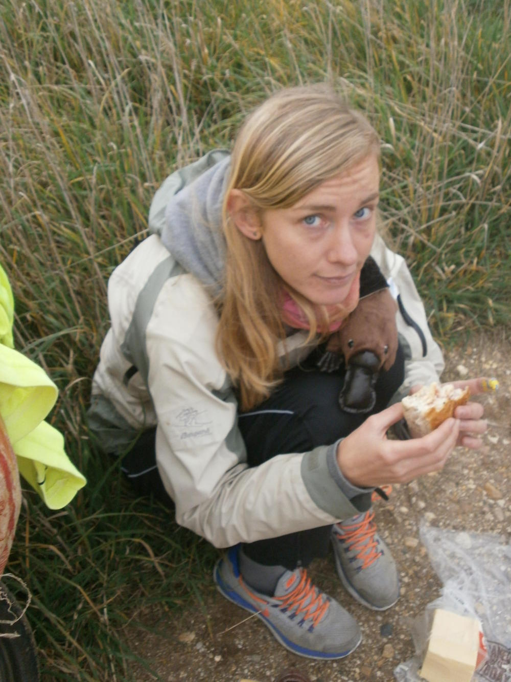 But our shopping trip was not fruitless. Though we would still be eating cold sandwiches for dinner we did have much more luck with the other items on our list, successfully purchasing food and reflective tape and a spoke key and a hi-viz vest and a platypus. In one of those cheap dollar-store style shops Dea had spotted a cuddly toy platypus and decided to buy it for me as a gift, I think so that Karen would have company, or perhaps so that she wouldn’t be the only one looking silly with a cuddly toy on her bike.