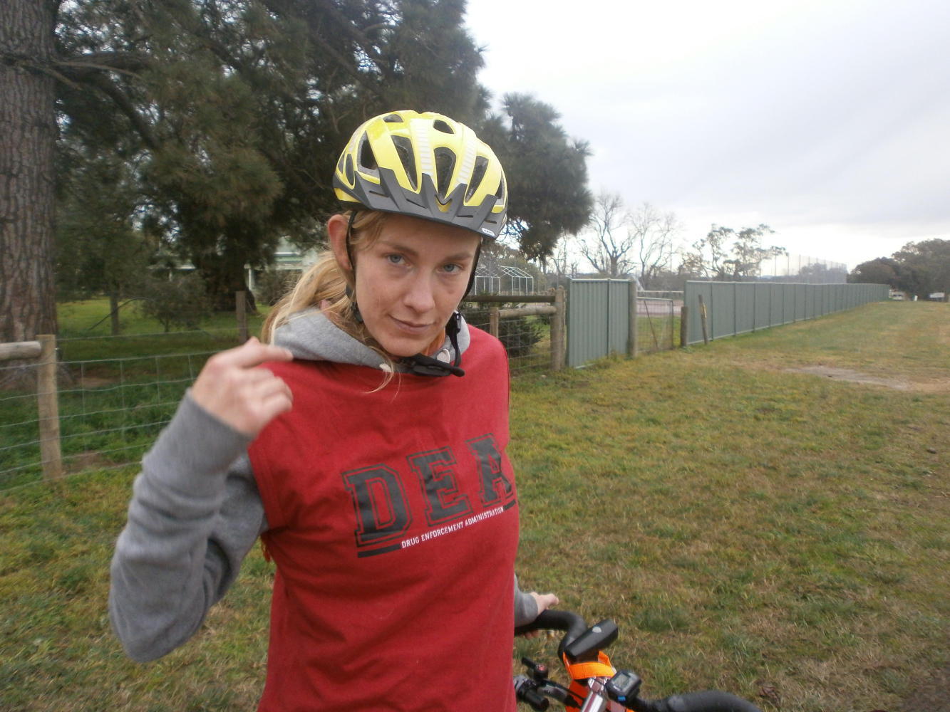 Trish looked at us a bit strange when the platypus appeared, but she still maintained an air of loveliness as she waved us off at the edge of town, gifting us a homemade cake to take with us. From there the road got a little busier than we would have liked, and there were even a few spots of rain, but it was alright really. We made friends with the platypus, who was called Plopples, because Dea made the mistake of letting me name him, and he spoke in a refined and well-mannered accent and said things like “It’s Mr Plopples if you don’t mind.” Other than that the rest of the day passed without incident, so I’ll just leave you with a couple of photos of Dea looking first of all very adorable, and then seriously badass.