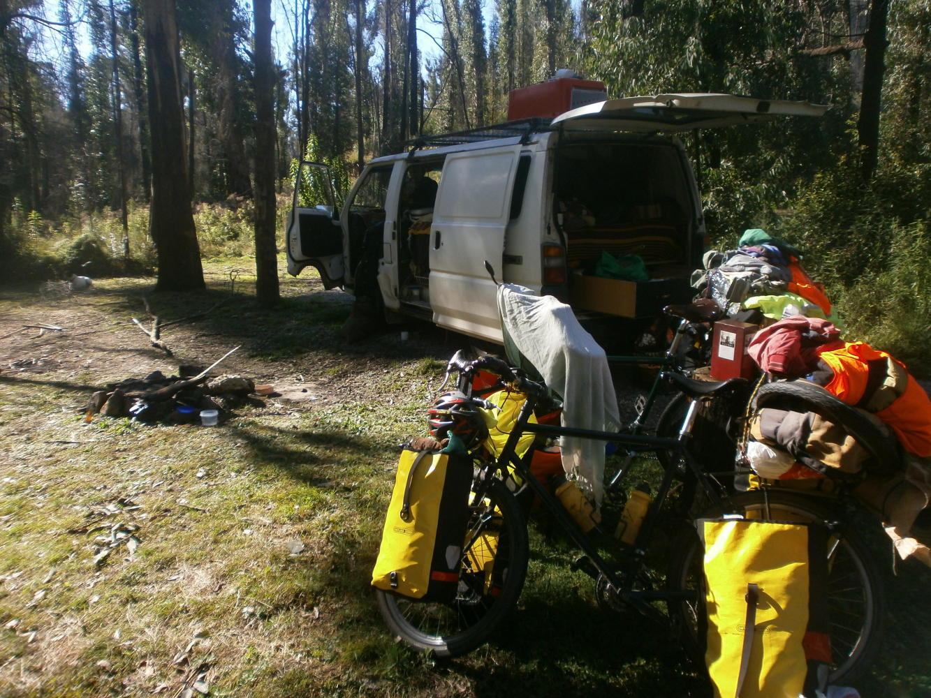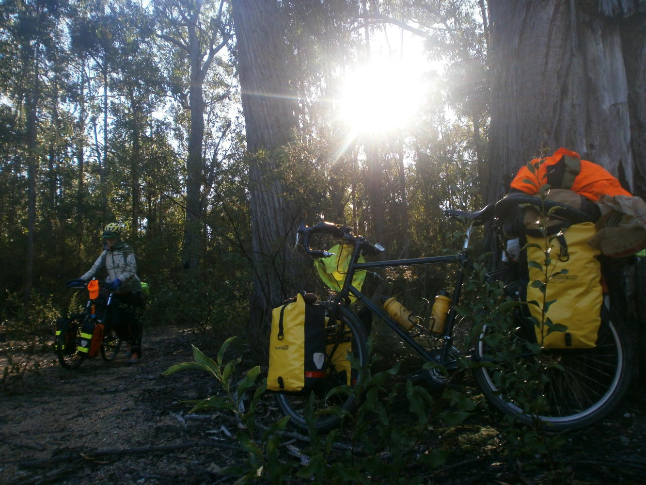 We came to a rest area beside a stream, and chose to take a rest. But we were not alone. A van was parked up and a young couple were sitting on the picnic bench near to the embers of a campfire. They were Joe and Zoe, from South Africa and Tasmania and they were driving up the coast from Melbourne, although they were going a bit faster than us, having only left a couple of days previously. We introduced ourselves, although Dea need not really have bothered as she was wearing her Drug Enforcement Administraion vest, and consequently had her name emblazoned across her chest. They were very nice, and let us use their stove to cook some food, ours being broken, whilst we chatted and exchanged stories. Hearing that we were planning to work pedicabbing up in Gold Coast, Joe suggested that we would probably be able to make a profit if we also sold weed on the side. Then we talked about tree planting in Canada, because Zoe was planning to go and do that, and I did it back in 2011, so I told her about it. Then Joe chipped in that you could probably also make money trimming weed out there. They were a lovely pair, were Joe and Zoe, and we spent a couple of hours chatting with them, Joe mentioning weed whenever he could, before bidding them farewell and continuing our ride. As we cycled off Dea whispered “He talked about weed a lot didn’t he. He must not have noticed my shirt.”