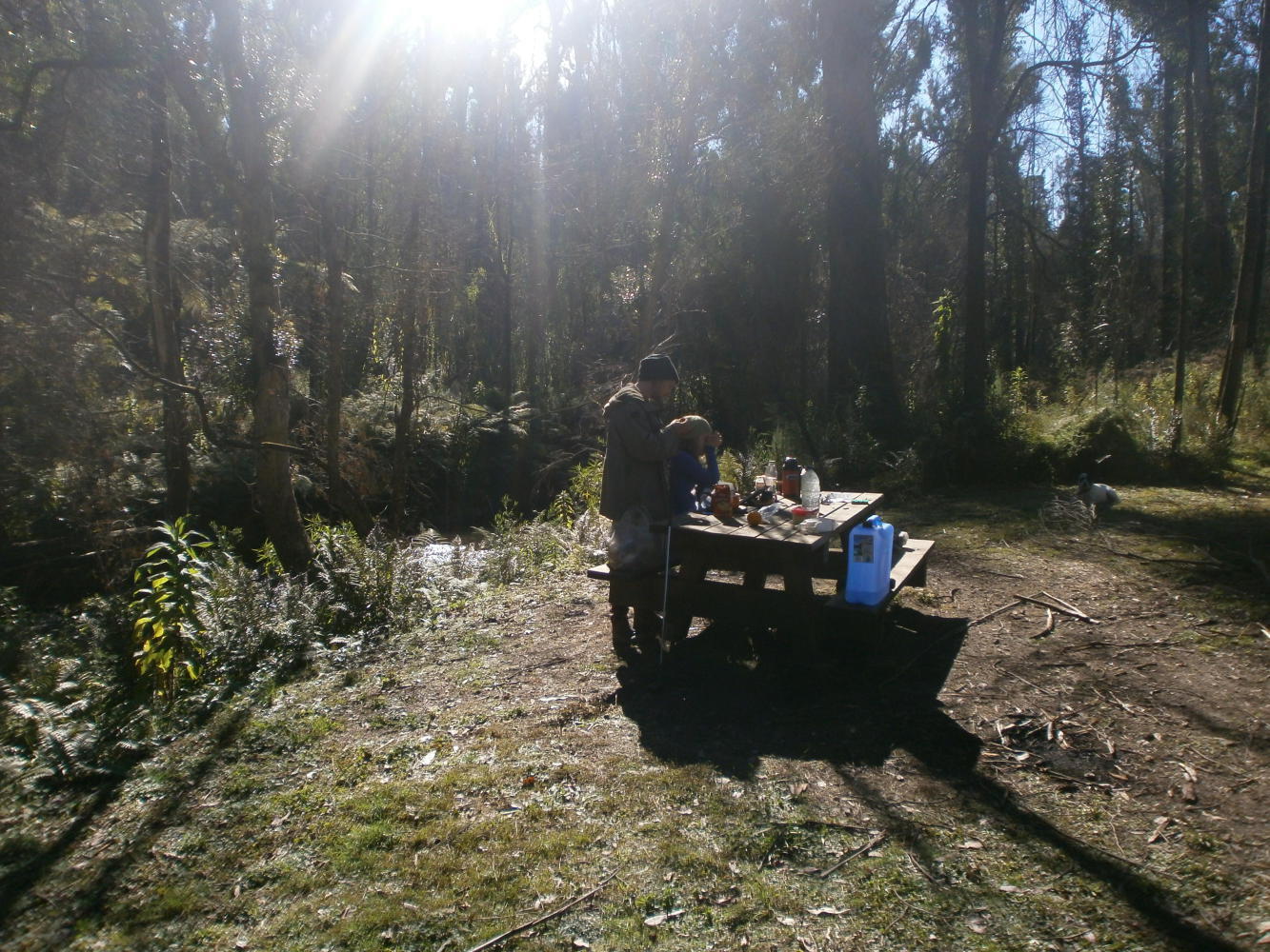 We cycled for a few more hours that afternoon, thoroughly pleasant it was too. With no more BeeGees to think of we had ourselves a new game too. After the success of the horse spotting and the koala spotting we decided to now get points for spotting kangaroos, rabbits and llamas. Other than the joy of spotting a kangaroo and the general loveliness of the cycling I have not much else to report of the ride up to Goongerah, where we stopped for the night at a free campground. Joe and Zoe said that they might also stop here but there was no sign of them, and so we had the place to ourselves. Well, almost. Whilst Dea was busy scouring the nearby stream for platypuses I bumped into a man who was out walking his dog. It seemed he lived in a large tent next door to the campground and he had long white hair and wild eyes and a Cornish accent and was a bit, well, strange. I asked him if he had seen Joe and Zoe and he said that he had not, in a way which suggested that he might possibly have just killed them. I thought it best not to mention this to Dea.
