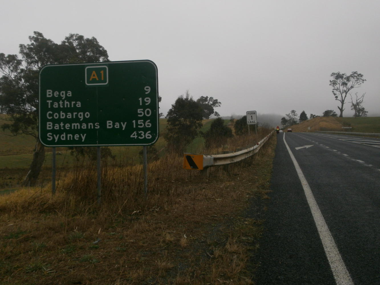 After leaving Candelo we had to ride on an uncomfortably busy little road and then take the Princes Highway the rest of the way to Bega. Although we’d been told we’d have to use this highway for most of our route this was in fact the first time we had been on it, and we only had to stay on it for ten kilometres. Fortunately this section mostly had a good shoulder. At Bega we spent quite a lot of time food shopping, or at least Dea did, whilst I stood in the shopping mall staring at a world map in a travel agent window. The map had Eurasia and Africa on the left and the Americas on the right, and consequently the whole of the Pacific Ocean was visible. It looked mighty big and intimidating, and was clearly going to be a major obstacle to be overcome on the mission to circumnavigate the planet without flying. Even so, I looked at it with great excitement as a new plan began to take shape in my head.