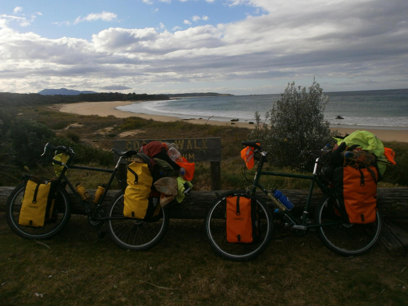 With Simone being so lovely it was an easy decision for us to take the next day off and have a rest day in the pretty seaside town. Although it was very scenic it was also very cold and we spent much of the day at the library planning our onward route to Sydney. In the evening Dea and I took a walk to watch the sunset over the beach and we both agreed Bermagui would be a very nice place to live, but there were no pedicabs, so we had to keep going to Gold Coast. After we walked back to Simone’s apartment another two cyclists arrived. Simone had double-booked her warmshowers hosts but that was okay, there was enough space and everybody was pleased of the company. The new arrivals were an older Italian couple who were doing something rather extraordinary.