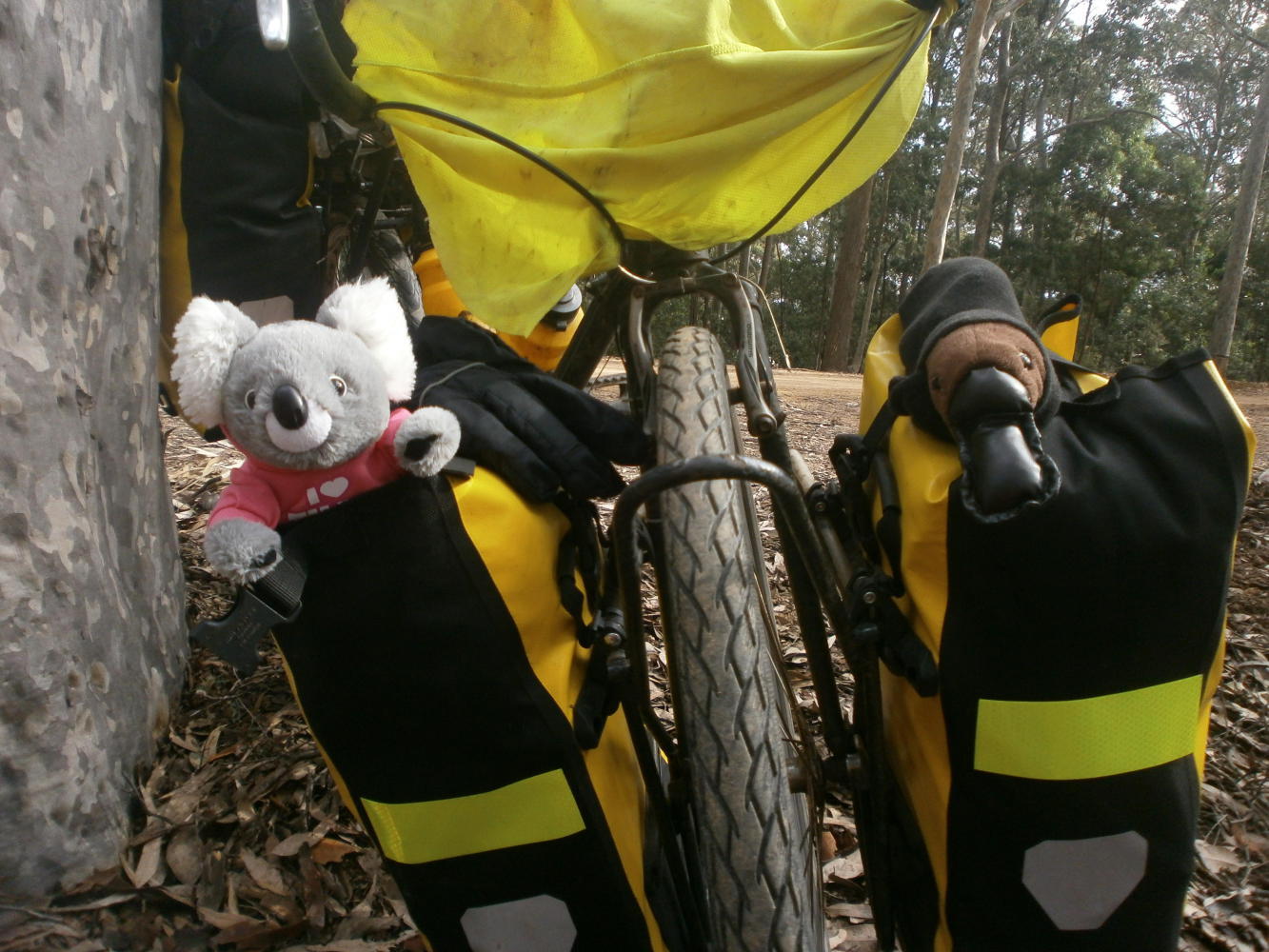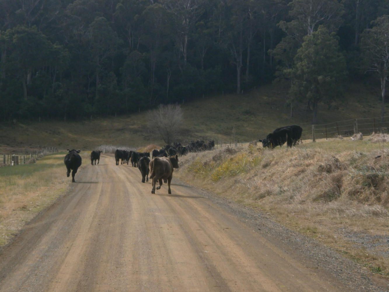 Back in the forest it was another wonderfully amazing and awesomely lovely day. Hardly any traffic to contend with and the only road congestion we had was when a herd of escaped cows blocked our path, and then ran ahead of us in such a way that we could not get past them. So we unavoidably herded them all down the road for quite some time, until a few slowed and we got around them, and some others ran into the forest, and eventually we could get through. Then there was just the fun cycling and the kangaroo spotting and me thinking about how, after such a long and at times very difficult journey, I should be so very, very fortunate to have this amazing riding right at the end of it all.