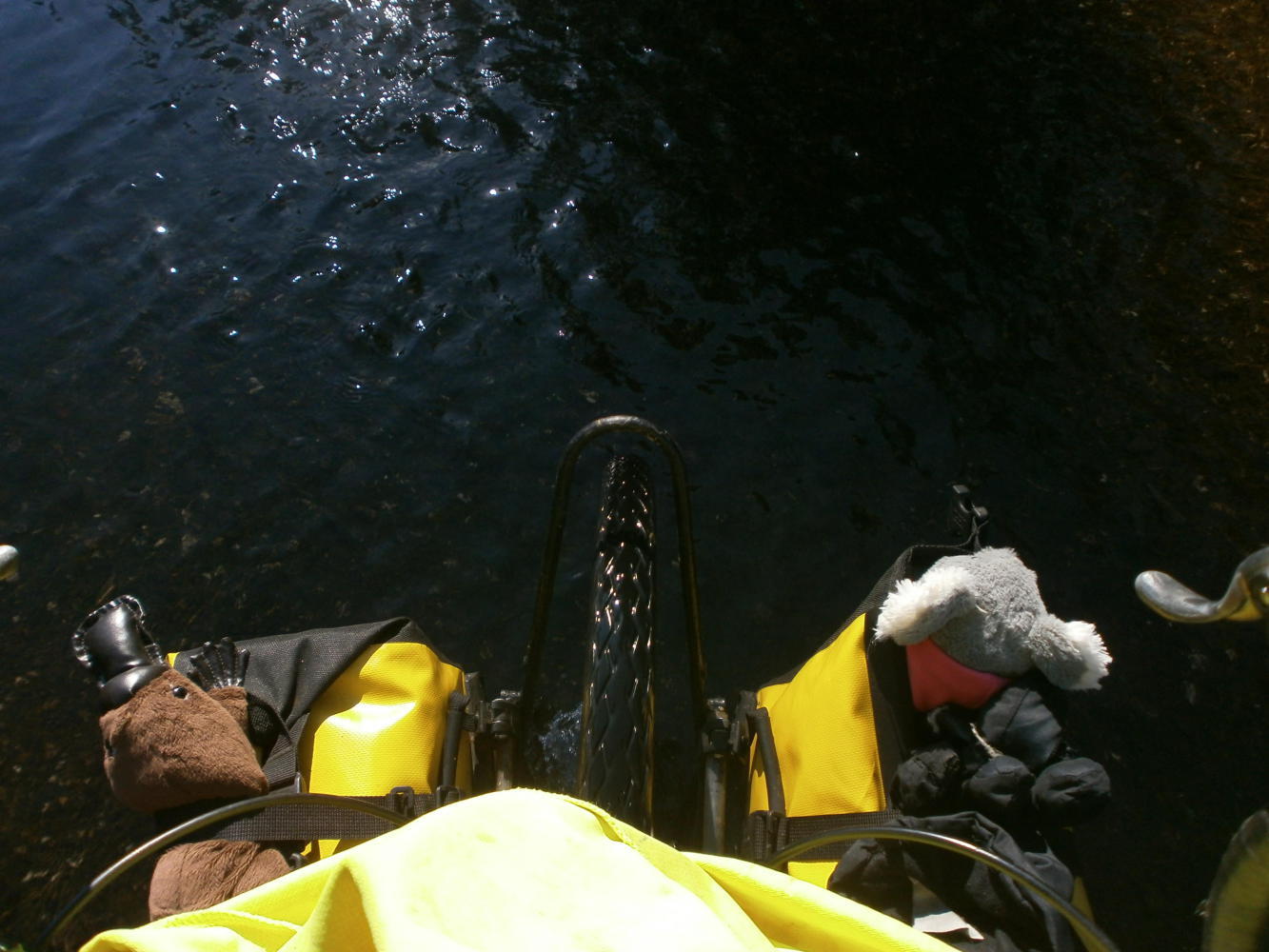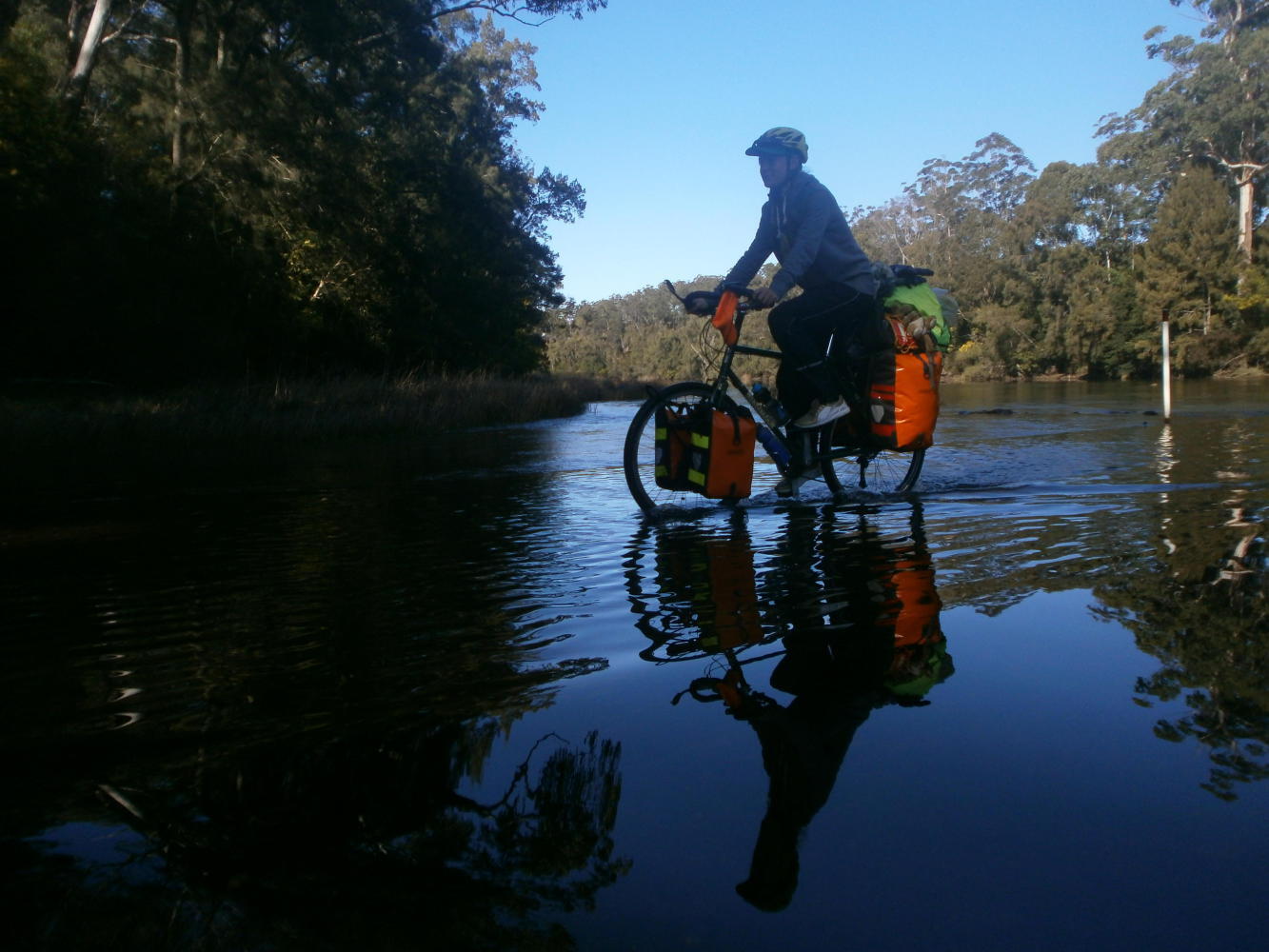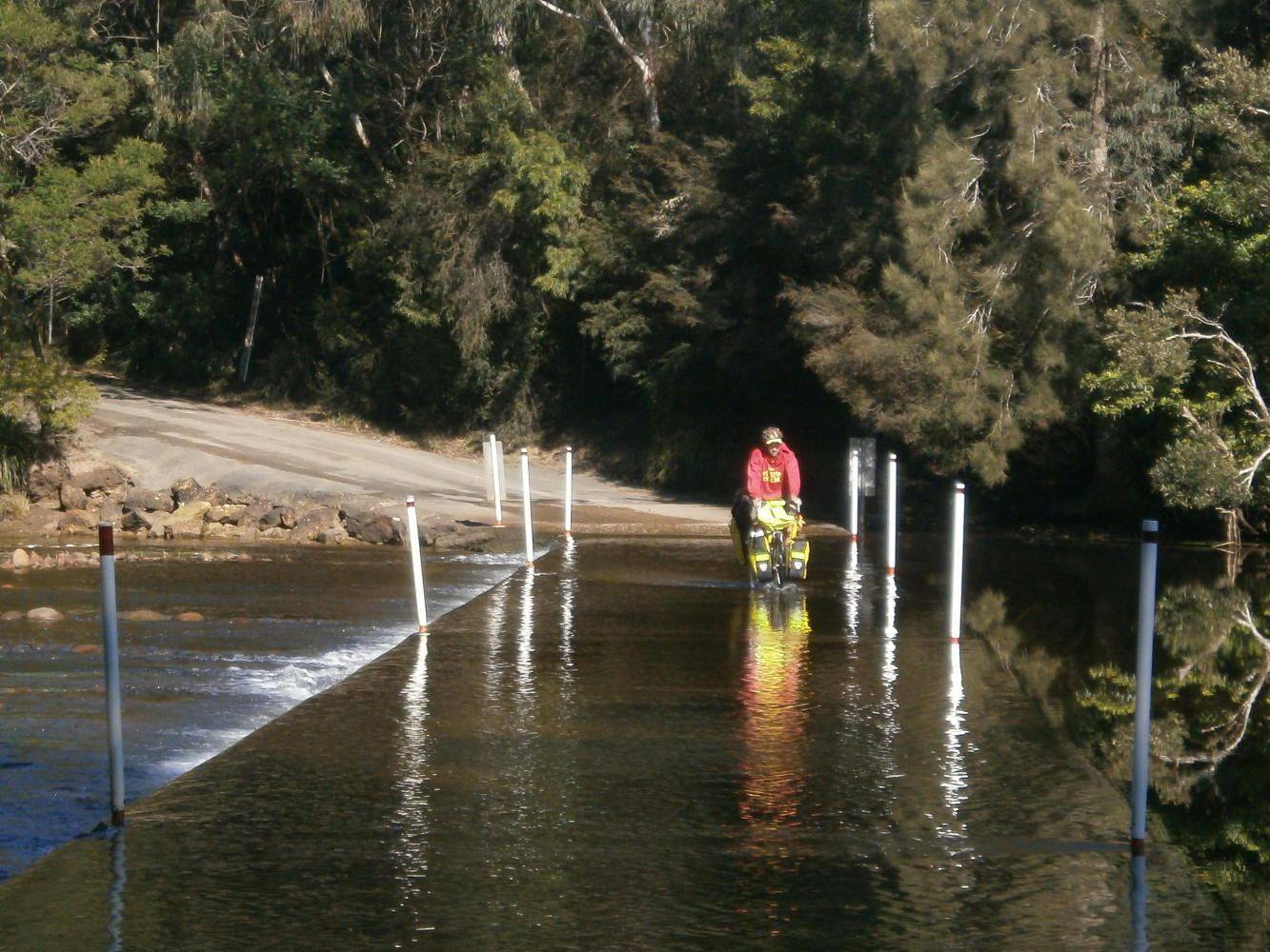 After all the build-up of anticipation it was an exciting moment to come down around a bend in the forest and finally reach the fabled ‘Shallow Crossing.’ The river was still very wide but the sceptical man’s assertion that it would be impossible to cross by bicycle was very much a false one. In fact it turned out that the clue had been in the name all along – it was a very shallow crossing. The gravel road ran down into the river, but a raised smooth concrete roadway linked to the other side with not more than ten centimetres of calm water passing over it. I went in first. The water didn’t even reach the bottom of my panniers and I could easily cycle across to the other side of the river without so much as getting my feet wet. I did get my feet wet though, because it was such an awesome novelty to be cycling across a river that we both went back and forth across it three or four times and I even waded out into the river to get an awesome photo of Dea cycling on water.