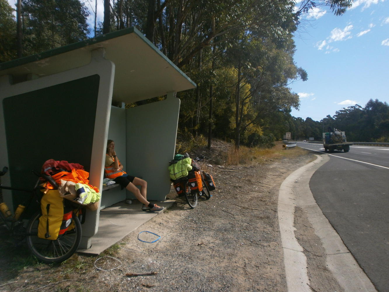 Unfortunately we then had to take Princes Highway for the next sixty kilometres. Most of the time it had a wide shoulder but it was very busy and when the shoulder disappeared on blind corners it was a bit terrifying. Then we stopped to take a break in a bus shelter and I was very much reminded of my time in Siberia. The road was very similar and I suppose I realised that I was a bit spoilt now. Sure, we had to do 60 kilometres on this road, but back in Siberia I’d done 3,000 kilometres on this type of highway, with the added danger of drunk Russians making dangerous overtakes. As we sat in the bus stop and I told Dea how it reminded me of sitting in a Siberian bus stop she responded by pointing out “That was a year ago wasn’t it?” And I realised that it really had been a year since Siberia, and I wondered where all the time could have gone.