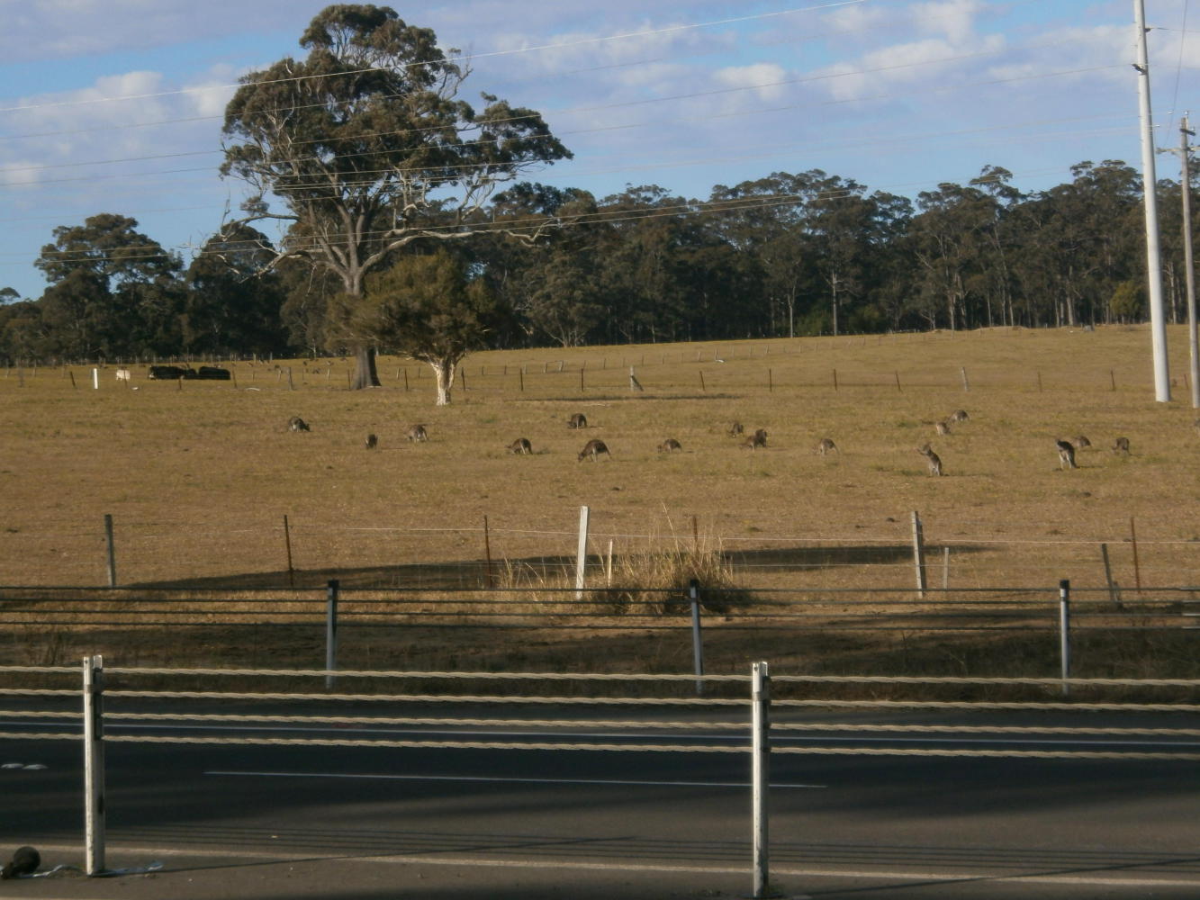 As if to remind me that I very definitely wasn’t in Siberia anymore I saw several herds of kangaroos. We’d temporarily postponed the kangaroo, rabbit and llama spotting game while we were on the highway because it was too dangerous to be doing things like that, but oddly enough it turned out to be the day when we saw the most kangaroos. I saw four or five separate herds of about twenty kangaroos in fields right next to the major road, completely indifferent to the noise of all the traffic.