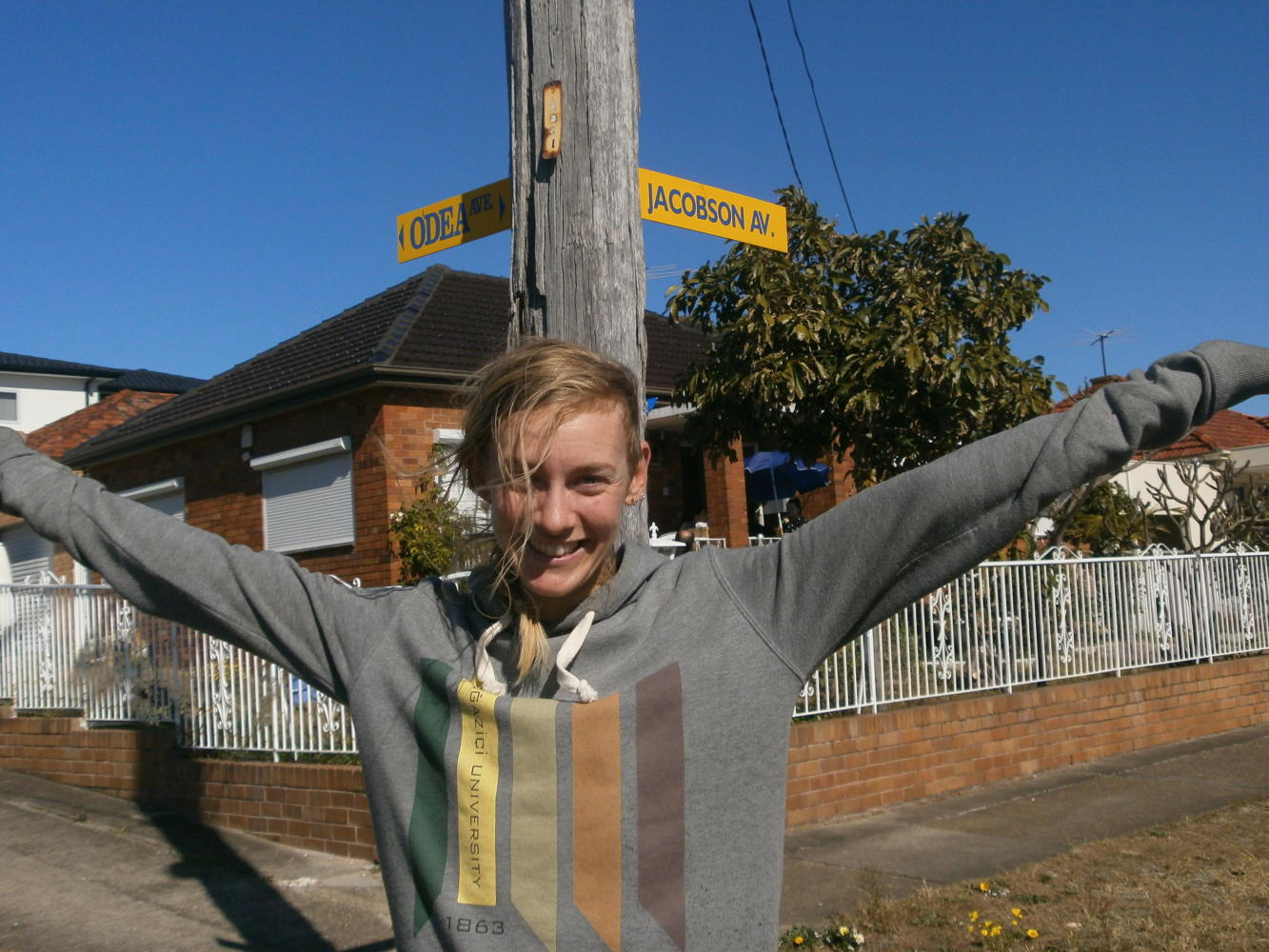 Having planned the route so meticulously I knew that we would briefly cycle along a street named O’Dea Avenue, which I was looking forward to surprising Dea with, but when we got there I was equally surprised. By an amazing coincidence the first cross street on O’Dea Avenue was Jacobson Avenue. It was such an extraordinary happenstance that I could barely believe, and I subjected Dea to a hundred photos of her beneath the two signs that bore her full name. I insisted on photos of her from all angles, with and without her bicycle, and all of this went on so long that eventually I had to explain to the family that happened to be sitting outside of their home on the corner of O’Dea and Jacobson what the hell we were doing. “Her name is Dea Jacobsen!” I shouted “Isn’t it amazing?!”
