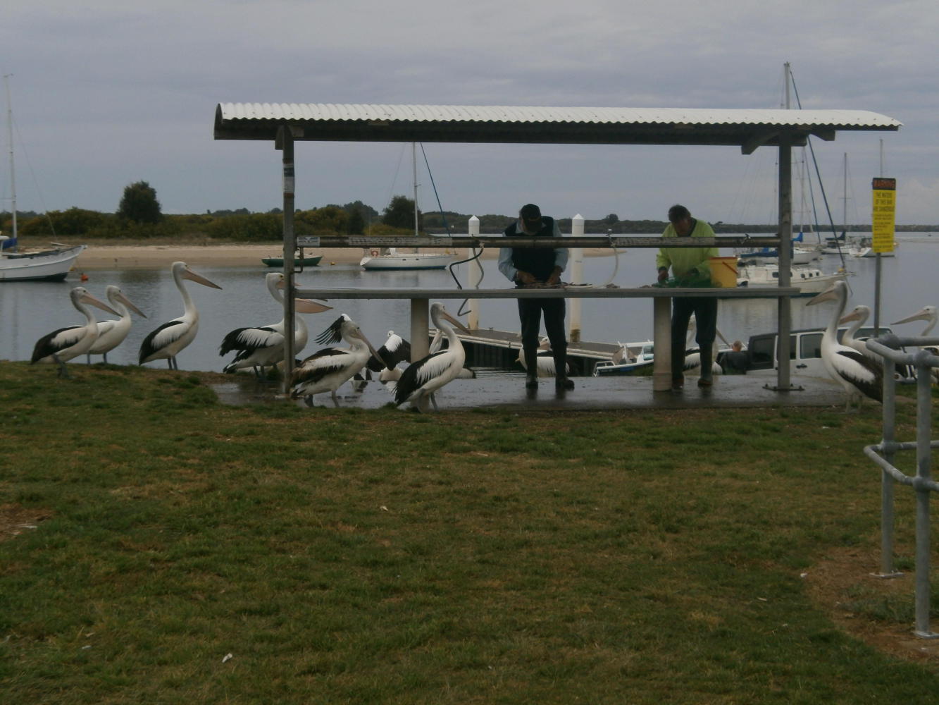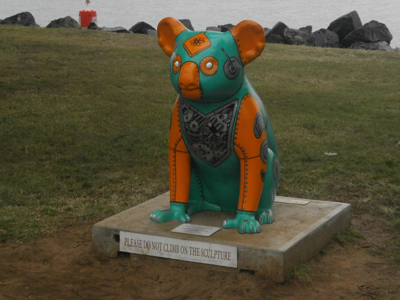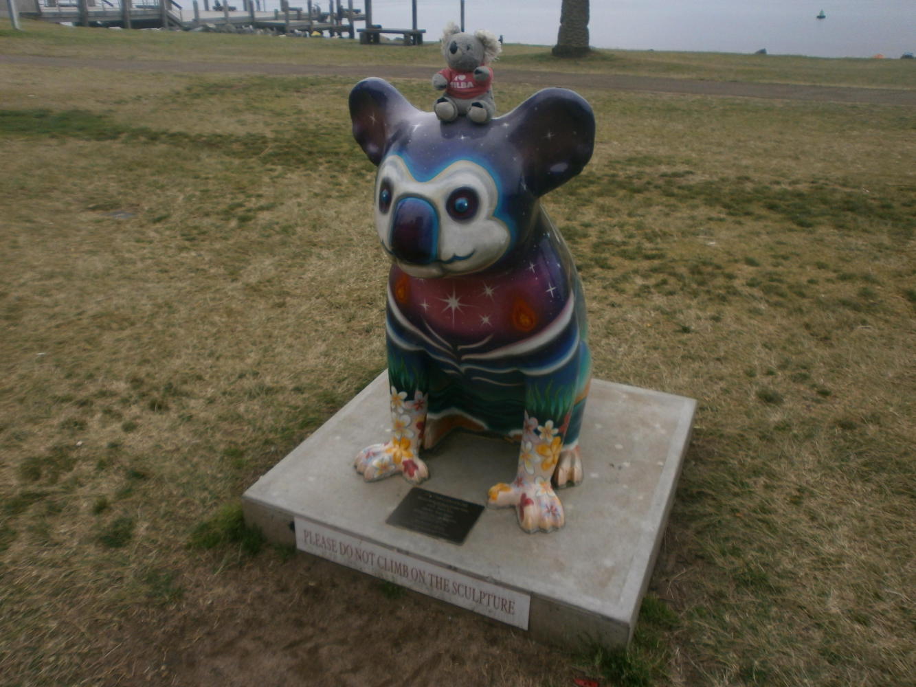 We had some time to kill before it was time to go to our hosts' house, and so we watched the pelicans and examined the koala sculptures. The pelicans were particularly interested in the table where the fishermen were gutting their fish, whilst the koala sculptures were just interesting. There were dozens of them all around the town, each with its own unique design.