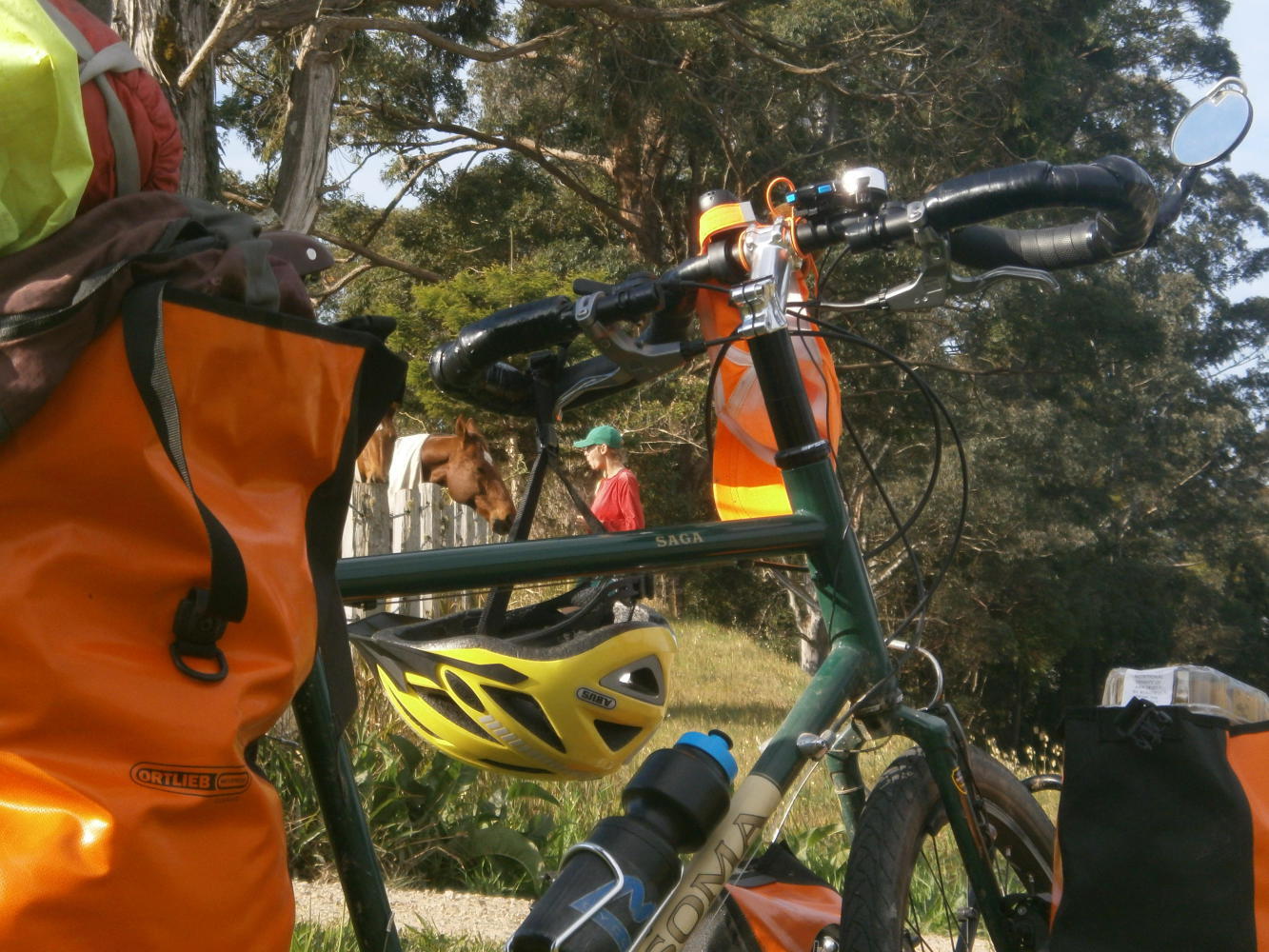 The road wasn't really very nice. There was no shoulder and too much traffic and at one point I was run off the road by a big truck. I don't like it when that happens. But there were no other choices, we had to keep going with this road. Dea was doing just that, she was off ahead again. But I caught her up when she stopped at a little gravel lay-by. I pulled over to see what was up, and she announced that she had just reached 2000 kilometres cycled since we began together in Melbourne. No mean feat and I naturally offered her a high-five and a “Way to go Dea!” And then just as we were about to continue on our way she happened to glance at my front left pannier and then, with a concerned look, asked me “Where is Mr Plopples?”