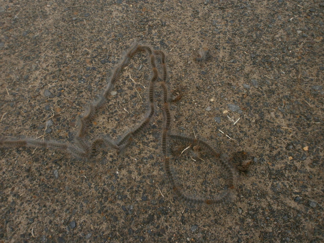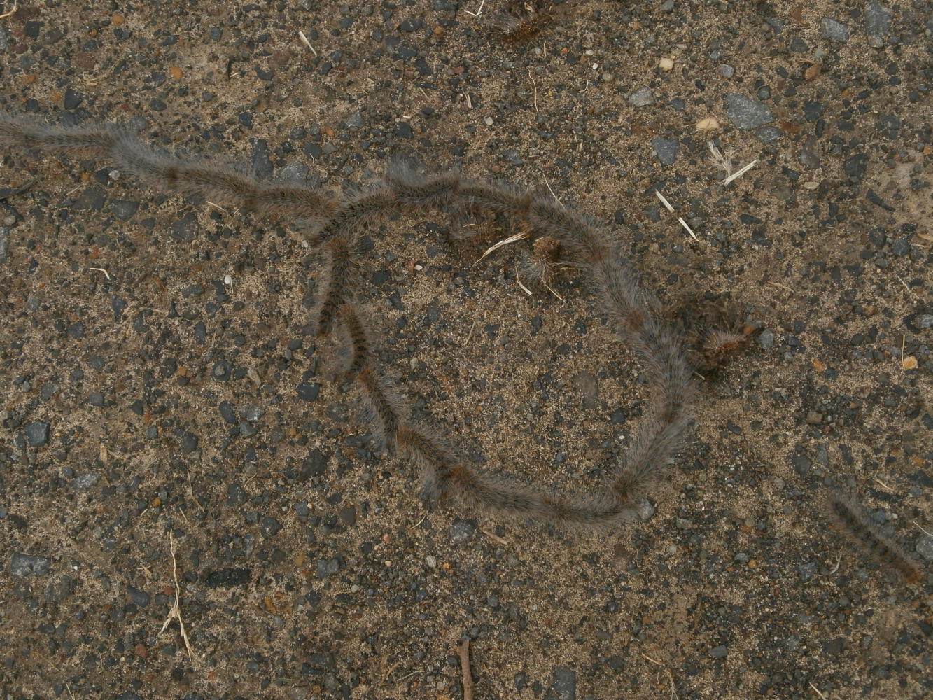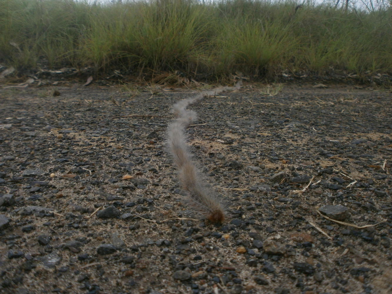 The caterpillars were fairly bulky and fuzzy things, with long hairs, and they were so interesting that I remained with them watching their activities for the best part of an hour. I had never seen anything quite like it. On the far side of the road stretched a long puddle of water, a consequence of the previous afternoon's storm, and this proved an insurmountable barrier to the lead group of caterpillars. The first guy, to his credit, made a bold attempt to swim for it, but turned back fairly quickly and they all began to head back across the road. The responsibility for leading the second group, held up by the death of their companions, now fell upon the first survivor. Given this chance by mere fate he turned out to be not quite up to the job. Instead of proceeding past the victims and marching onward he instead turned and looped around in a big arch, which inevitably eventually brought him back around to the line that he was leading. He then shoved his way back into the line, presumably trying to hide himself in amongst what was now, absurdly, a spinning circle of caterpillars all following each other.