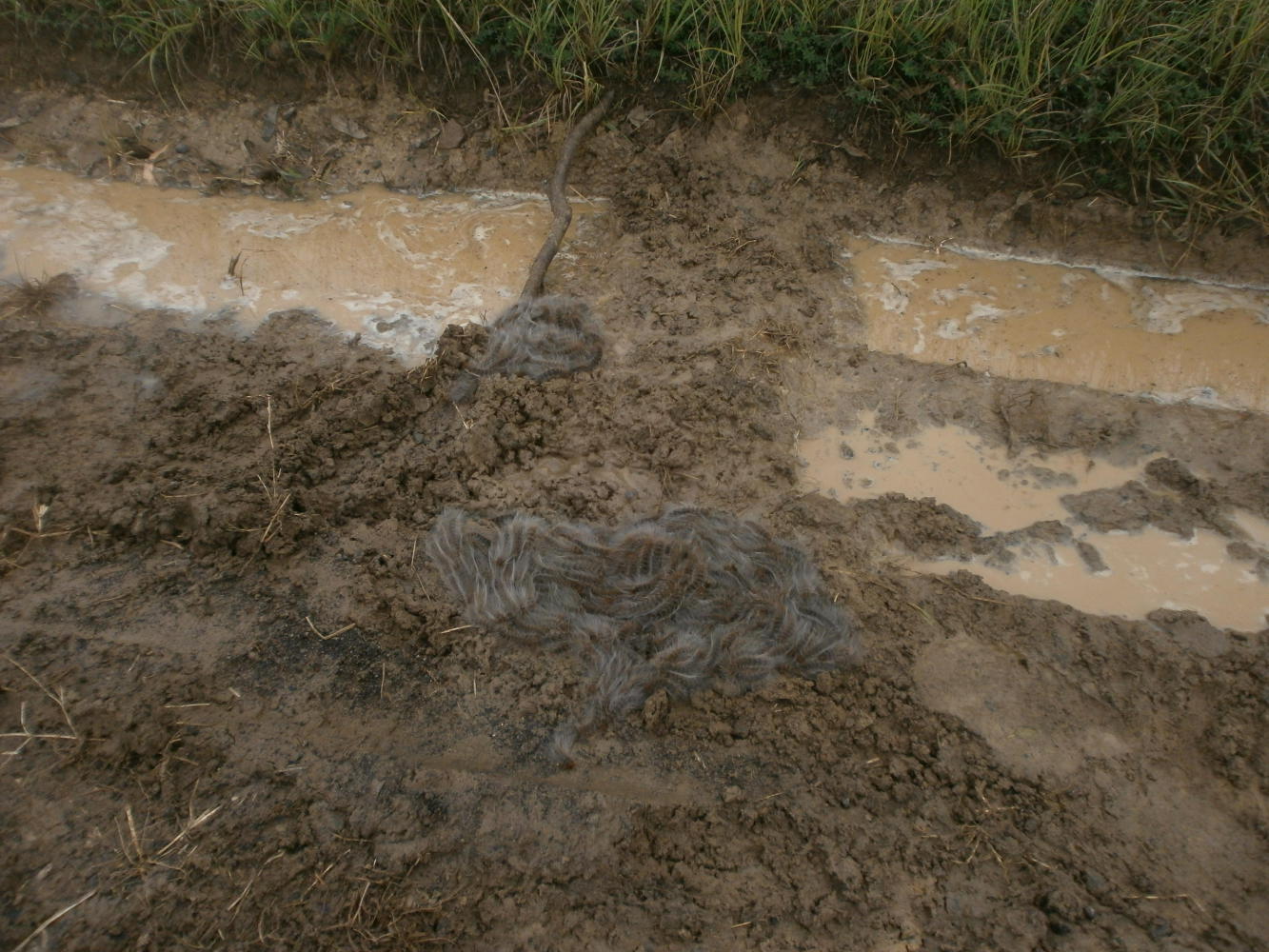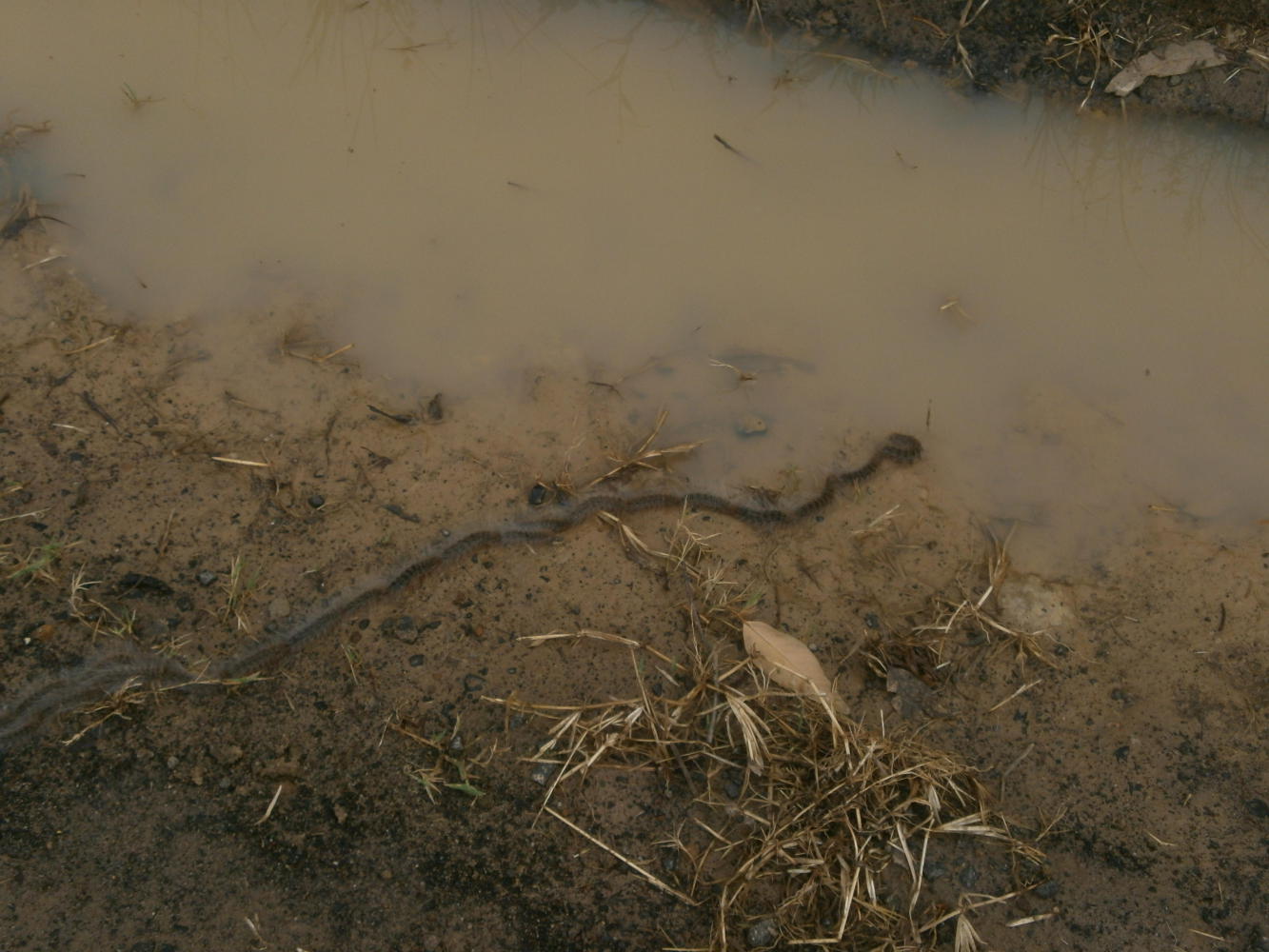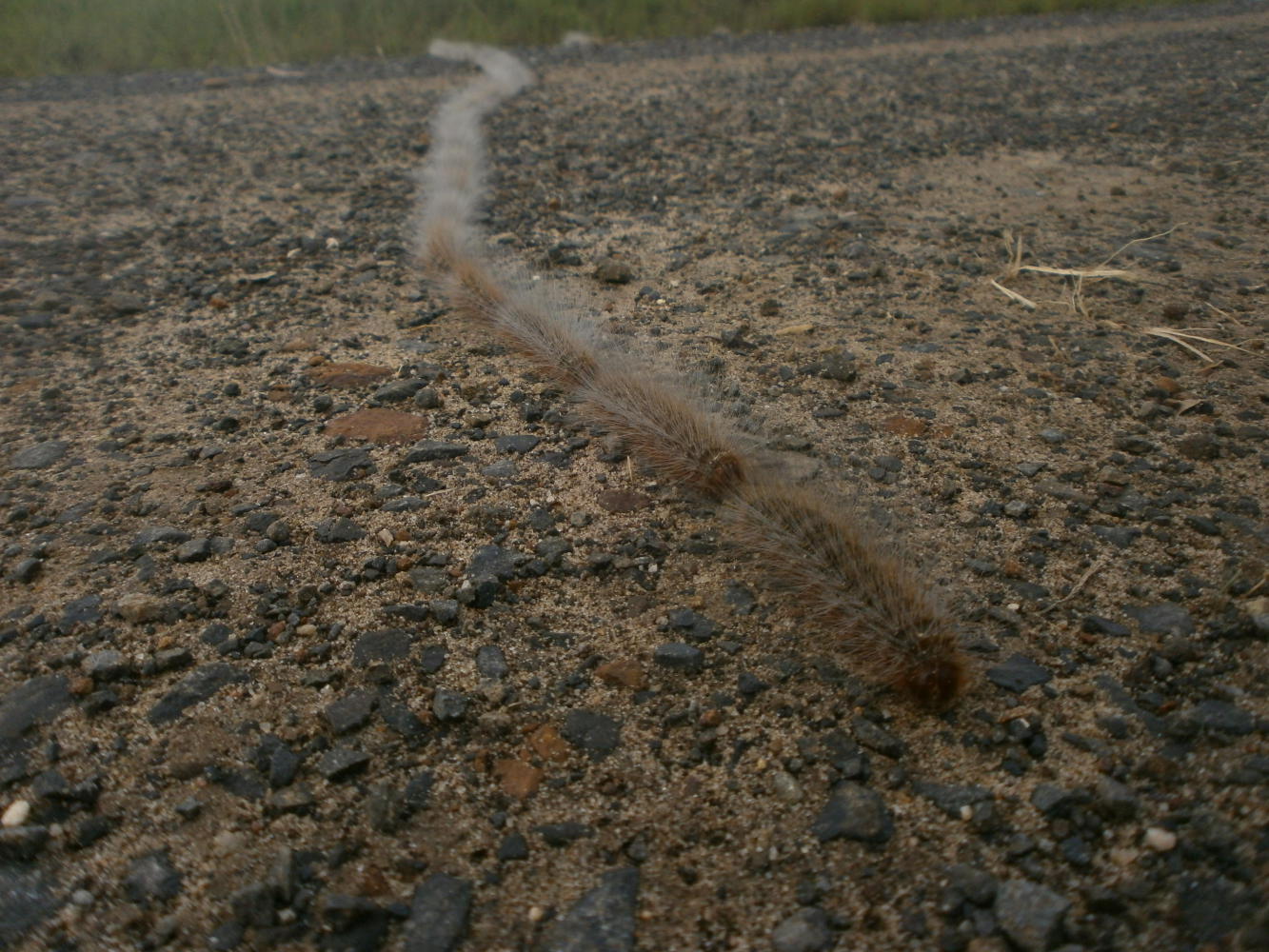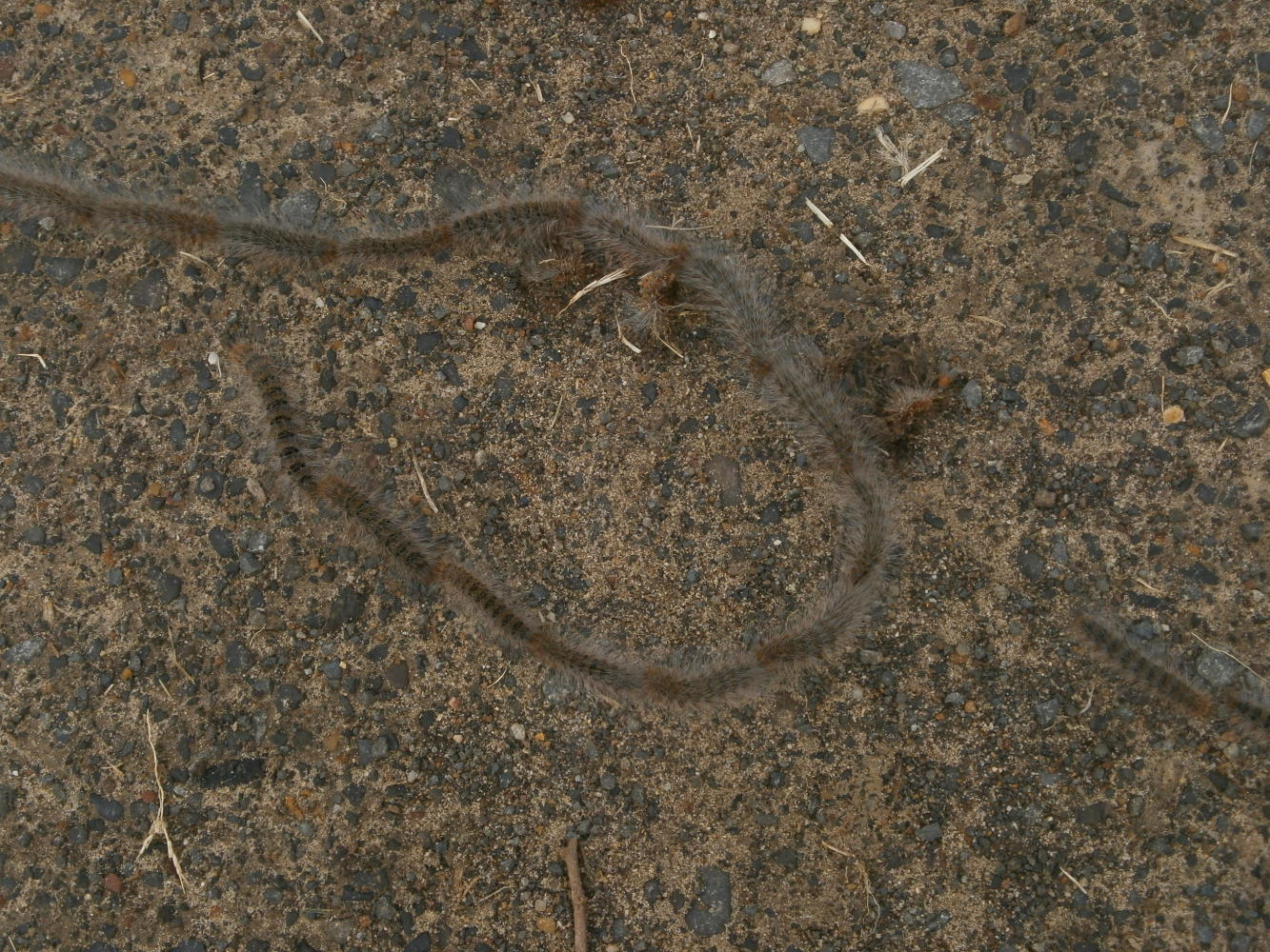 The caterpillars were fairly bulky and fuzzy things, with long hairs, and they were so interesting that I remained with them watching their activities for the best part of an hour. I had never seen anything quite like it. On the far side of the road stretched a long puddle of water, a consequence of the previous afternoon's storm, and this proved an insurmountable barrier to the lead group of caterpillars. The first guy, to his credit, made a bold attempt to swim for it, but turned back fairly quickly and they all began to head back across the road. The responsibility for leading the second group, held up by the death of their companions, now fell upon the first survivor. Given this chance by mere fate he turned out to be not quite up to the job. Instead of proceeding past the victims and marching onward he instead turned and looped around in a big arch, which inevitably eventually brought him back around to the line that he was leading. He then shoved his way back into the line, presumably trying to hide himself in amongst what was now, absurdly, a spinning circle of caterpillars all following each other.