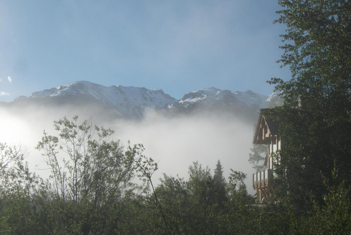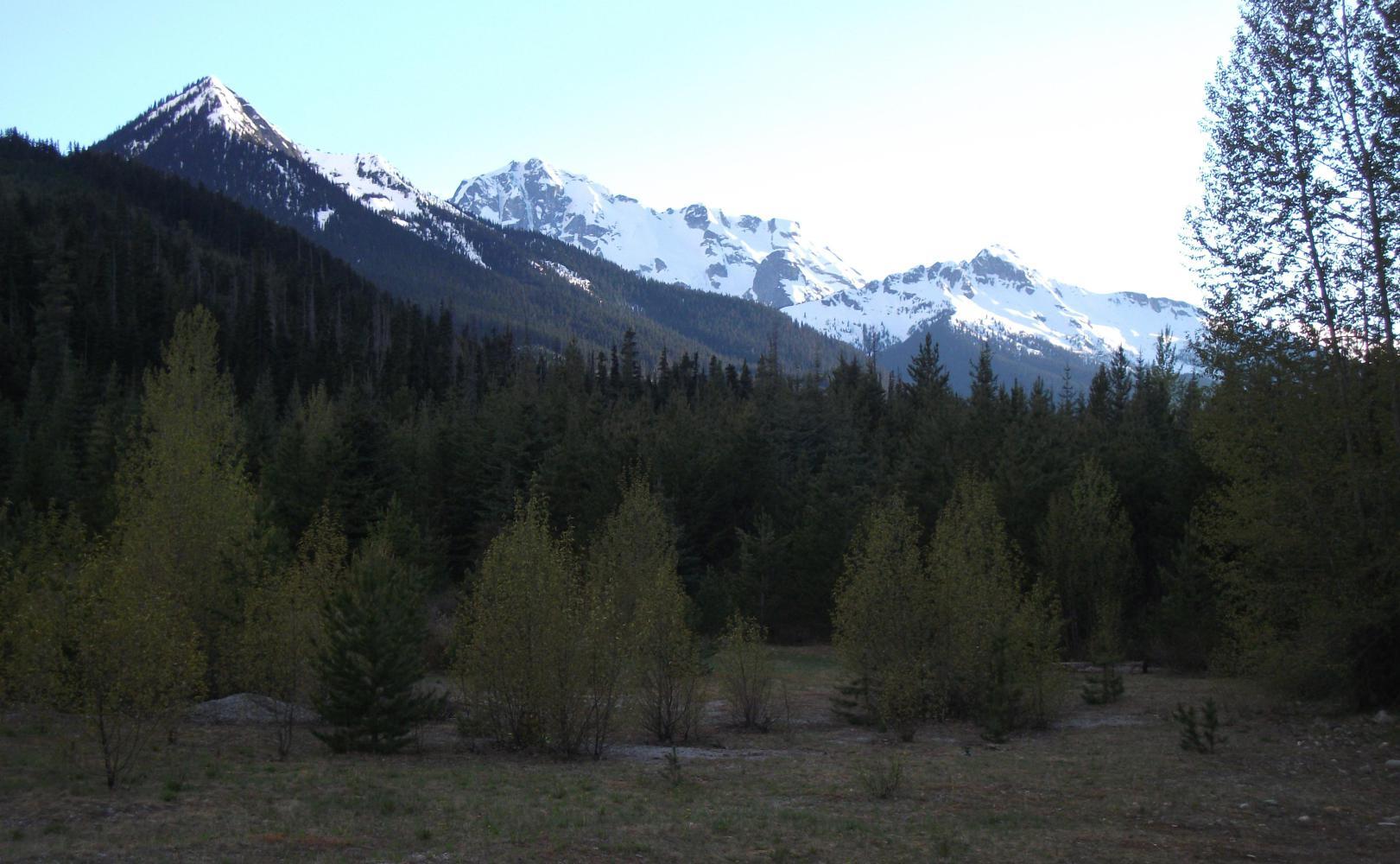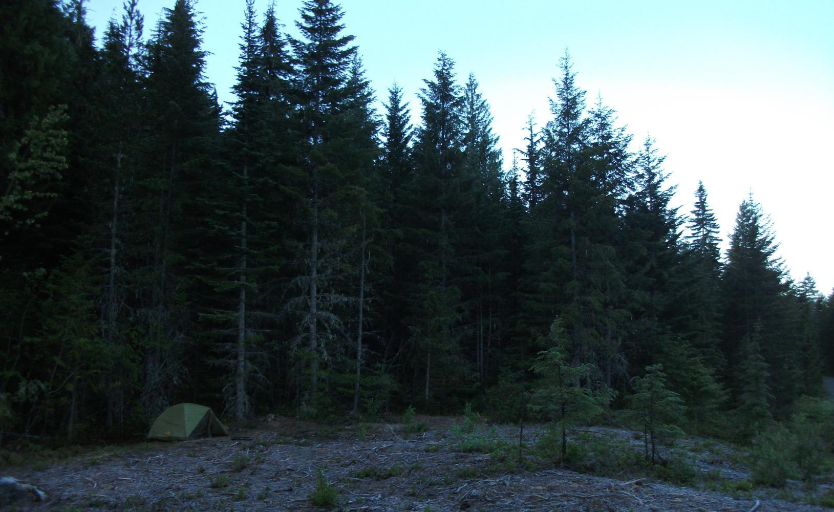 I didn't hang around to enjoy this weather though, and quickly zoomed down the other side back to more pleasant conditions. Being quite tired from my exertions it was a fairly easy decision for me to stop early and make camp when I chanced upon the most perfect place. It was a semi-clearing dotted with green and yellow trees for shelter, and I guessed it might once have actually been a campsite. There were views to snowy peaks on all sides and a fast-running creek at the bottom edge. It was unimaginably picturesque. A perfect place to spend the night. As I went about it, going down to the creek to fetch water to make supper, I reflected on this, but once again I just wasn't satisfied. All I could think of was how much better it would be with Dea by my side.