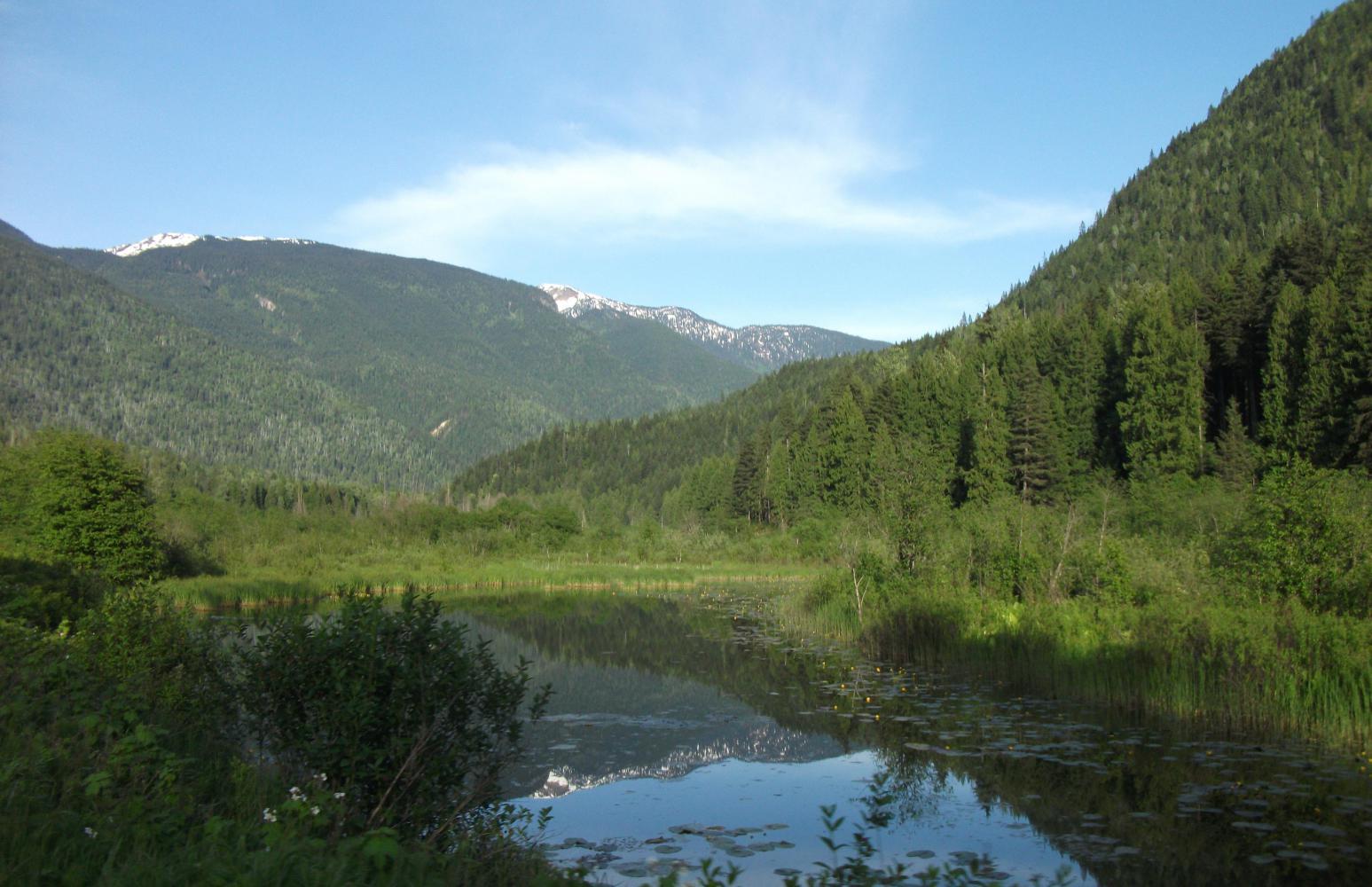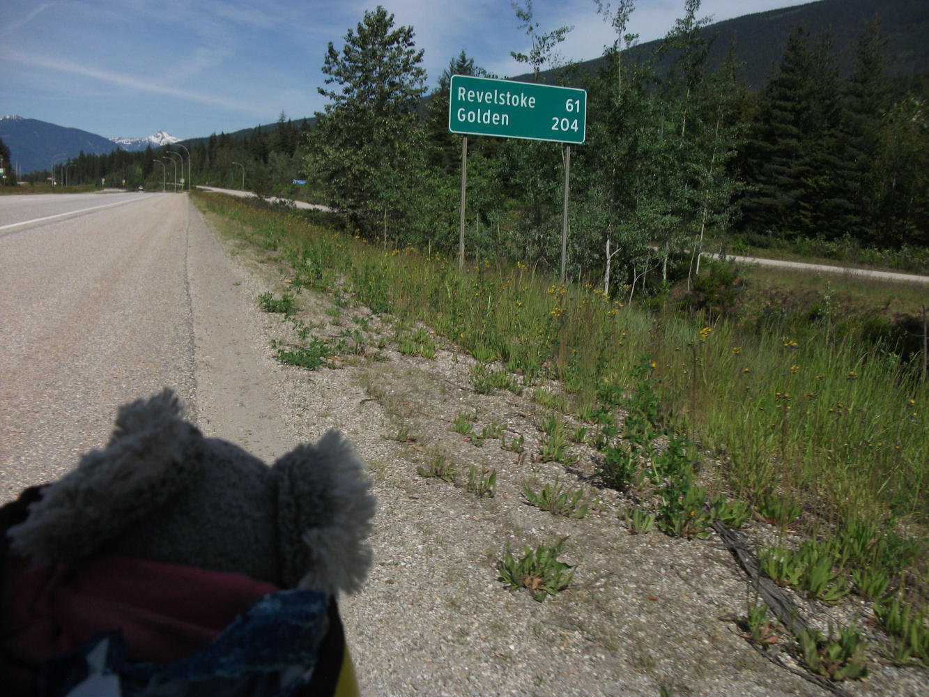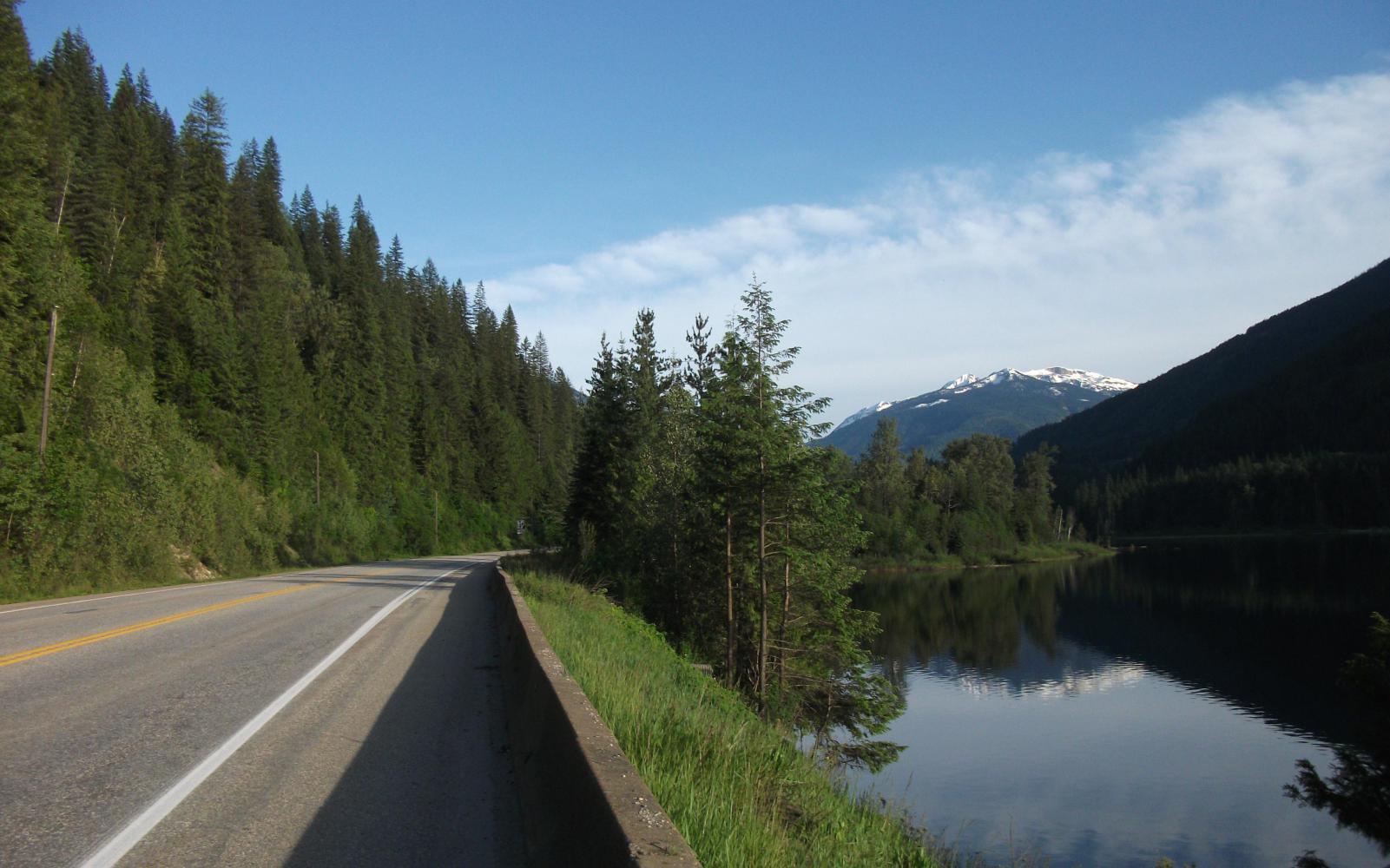 I rejoined the Trans-Canada and rode 25 kilometres to Sicamous, where of course I went to the library. A few hours there and I was back on my way. It was a nice and sunny day again. The road was good, not busy, and with a decent shoulder. I was excited because the day before I'd returned to gradually more forested areas, and now I was heading back towards the snowy mountains and spectacular scenery of national parks.