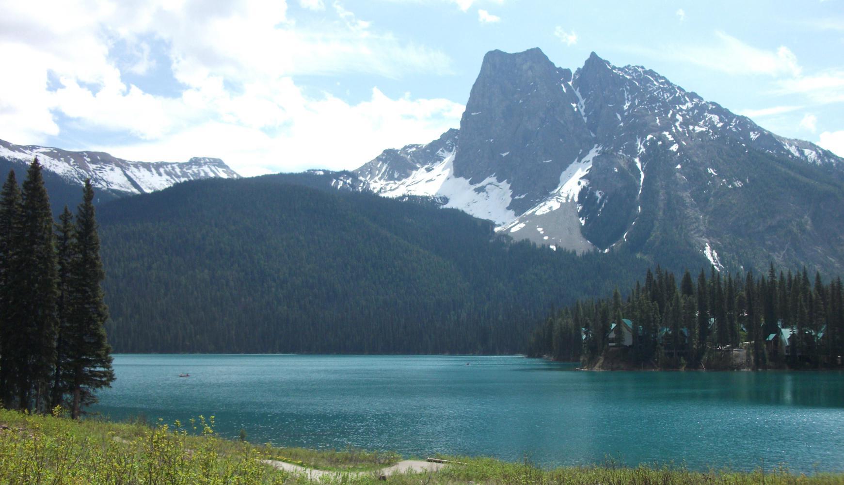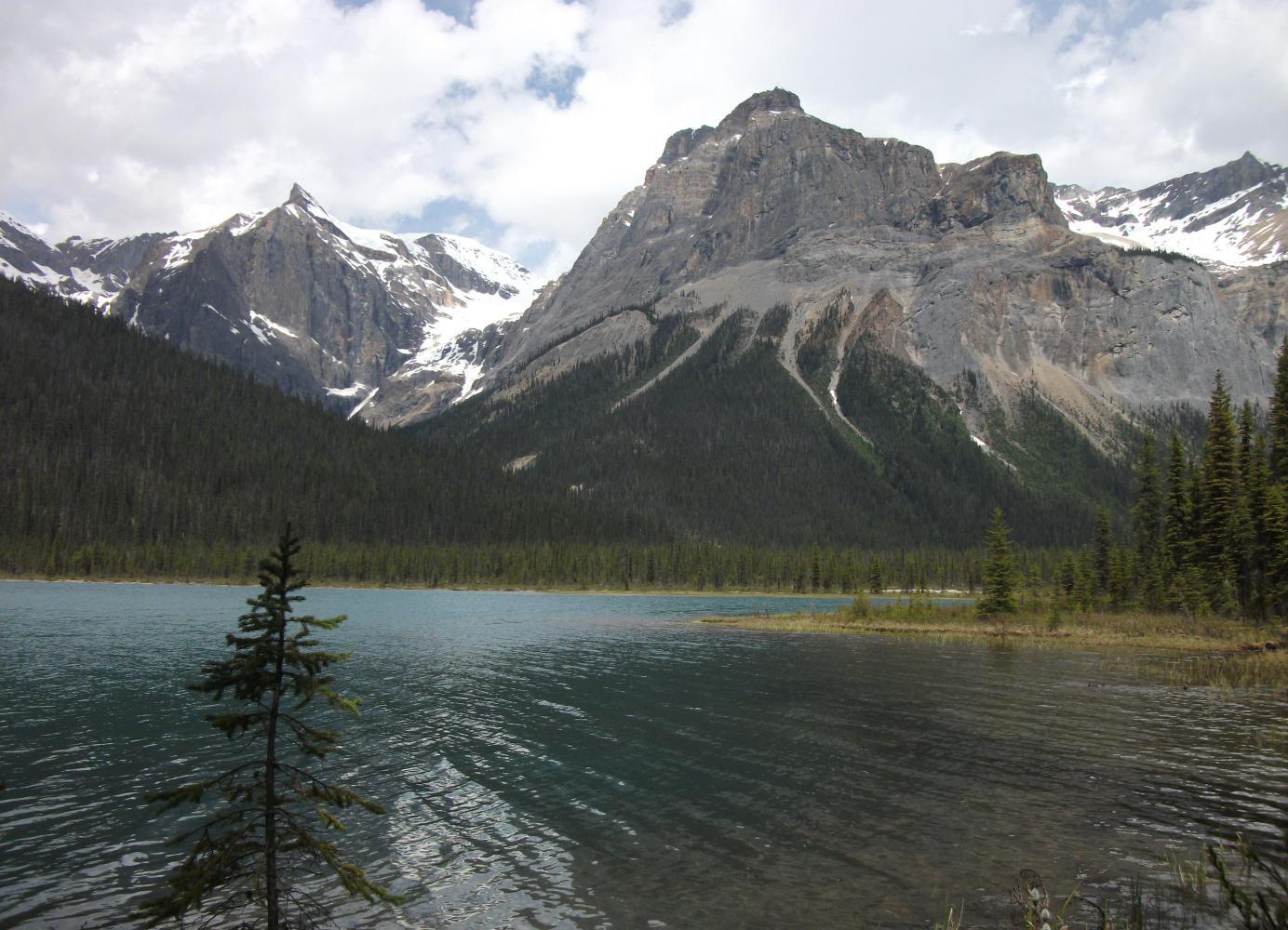 Emerald Lake was worth taking the risk for (although perhaps not worth paying for the park pass for.) It was pretty, quite big, and it had a turquoise colour that had clearly been a major factor in the name-giving process. There were snowy peaks around it too of course, although it was also a bit touristy, with a collection of cabins at one end and kayak and canoe rentals available. Actually, had Dea been with me I might have been up for a paddle, but alone it seemed silly, so I settled for walking on the hiking trail that looped around the lake instead. I didn't notice the sign saying it was a 5.3 kilometre walk though, so it took quite a bit longer than expected. A beautiful place though, no doubt about that.