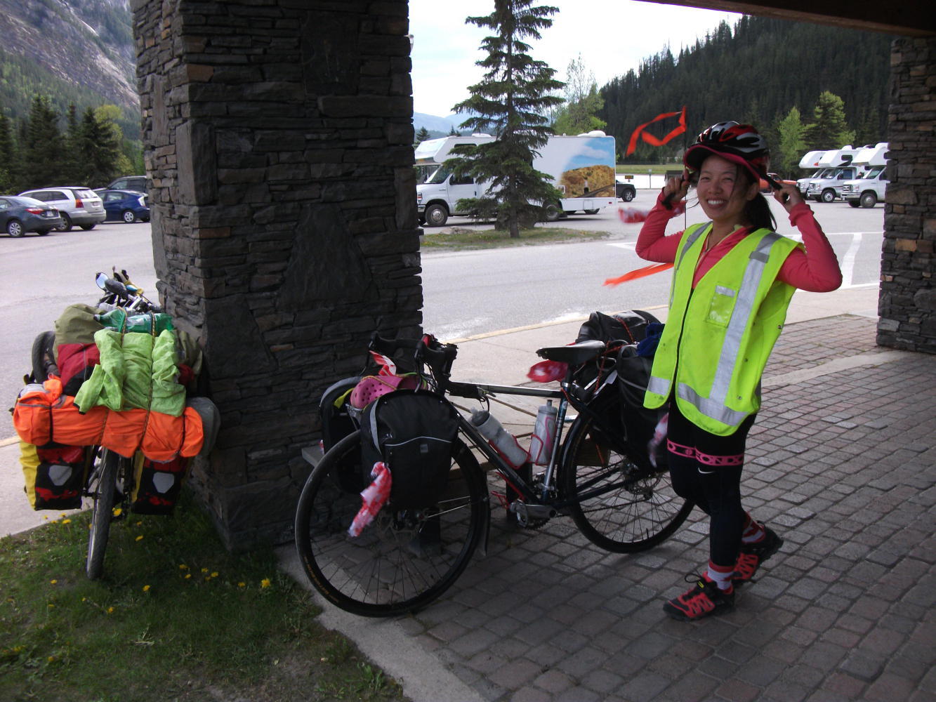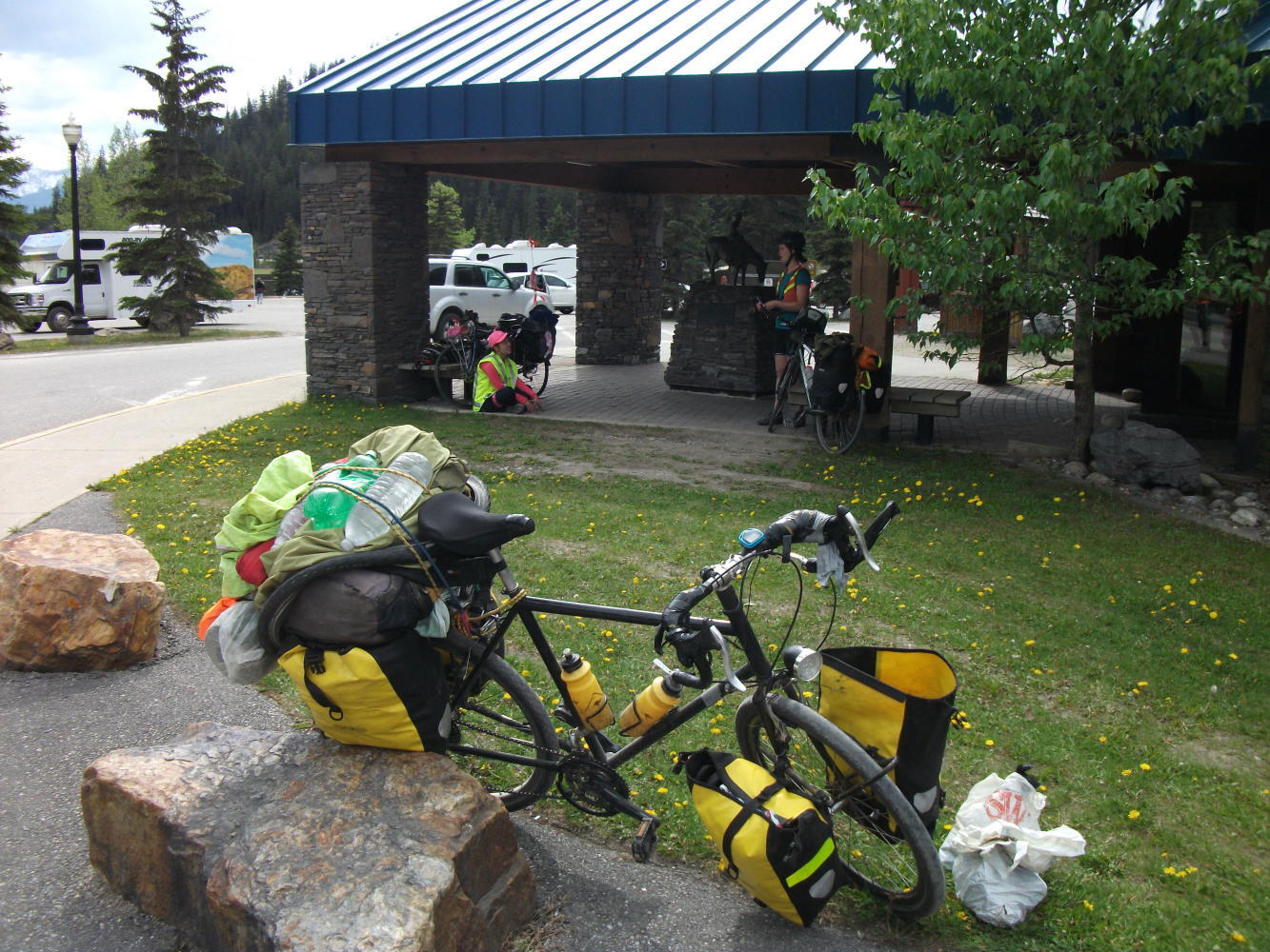 Unable to visit Lake O'Hara I was extremely pleased that I hadn't forked out on any park passes, but I was also looking for something else to offer a little interest to my ride, and outside of the visitor centre I might have found it. Another touring bike, a very small one, was locked up. I looked around, unsure who it belonged to, and was taken by surprise when another touring cyclist arrived, cycling up to the entrance area. It was a young female and I asked her if she was with this other bike. She said she was not, she was riding alone. At that point another young female emerged from the visitor centre and went over to the first bike. Thus we now had two solo female cycle tourists appearing in my life approximately four seconds from one another which, considering I had previously spent four years cycling around looking for one without any luck, was a bit of a funny coincidence. Of course I wasn't interested in these solo female cyclists in a romantic sense anyway, because I had a solo female cyclist of my own now, (who, rather annoyingly, was on a different continent. Oh, life!)
