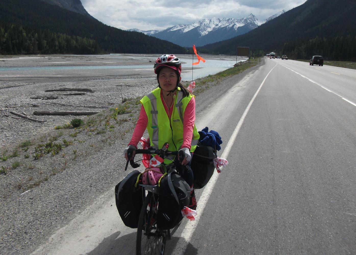 This girl, Vivian, was very short, and looked Asian, though she had a Canadian accent, the result of being born and bred in Ontario to parents from China and Hong Kong. Her goal was to cycle across Canada, from Vancouver to St Johns, Newfoundland. She was doing quite well so far, considering she had never ridden a bicycle for more than a couple of hours at a time before, although she had just accepted a lift for ten kilometres to make it here after losing all her food. I offered her some of mine and she gratefully accepted, while I took a look at her front wheel.