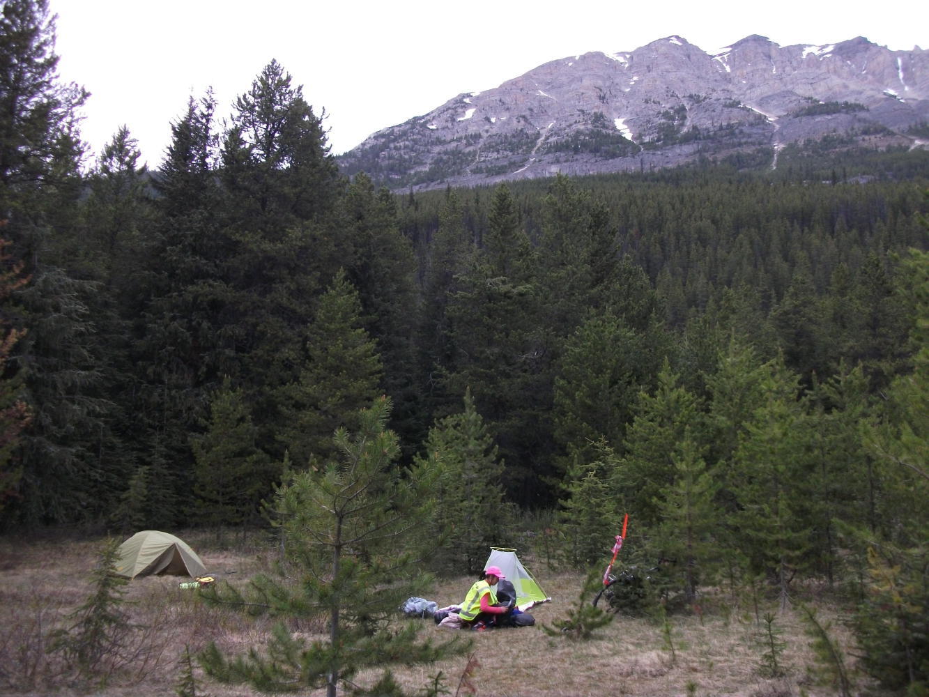 After a lot more cycling/walking we decided to make camp at the foot of the turn-off for Lake O'Hara, where we found what I thought was a great spot in a clearing with views of snowy mountains. Apparently, however, this wasn't Vivian's idea of a great spot. She seemed very concerned about the risk presented by wildlife, particularly bears, and she revealed that up until now she had been camping on the forecourt of gas stations. She made the best of things here, though, and put up her tent and unpacked her things. I did the same, somewhat faster, and then began to cook us dinner on my stove. We had to use my stove anyway, because Vivian's stove was one of the many things she had thrown away to save weight. Then, as I stirred the pasta in the pot I heard a sudden cry from behind me - “Oh look, here's my food! I didn't lose it after all!”