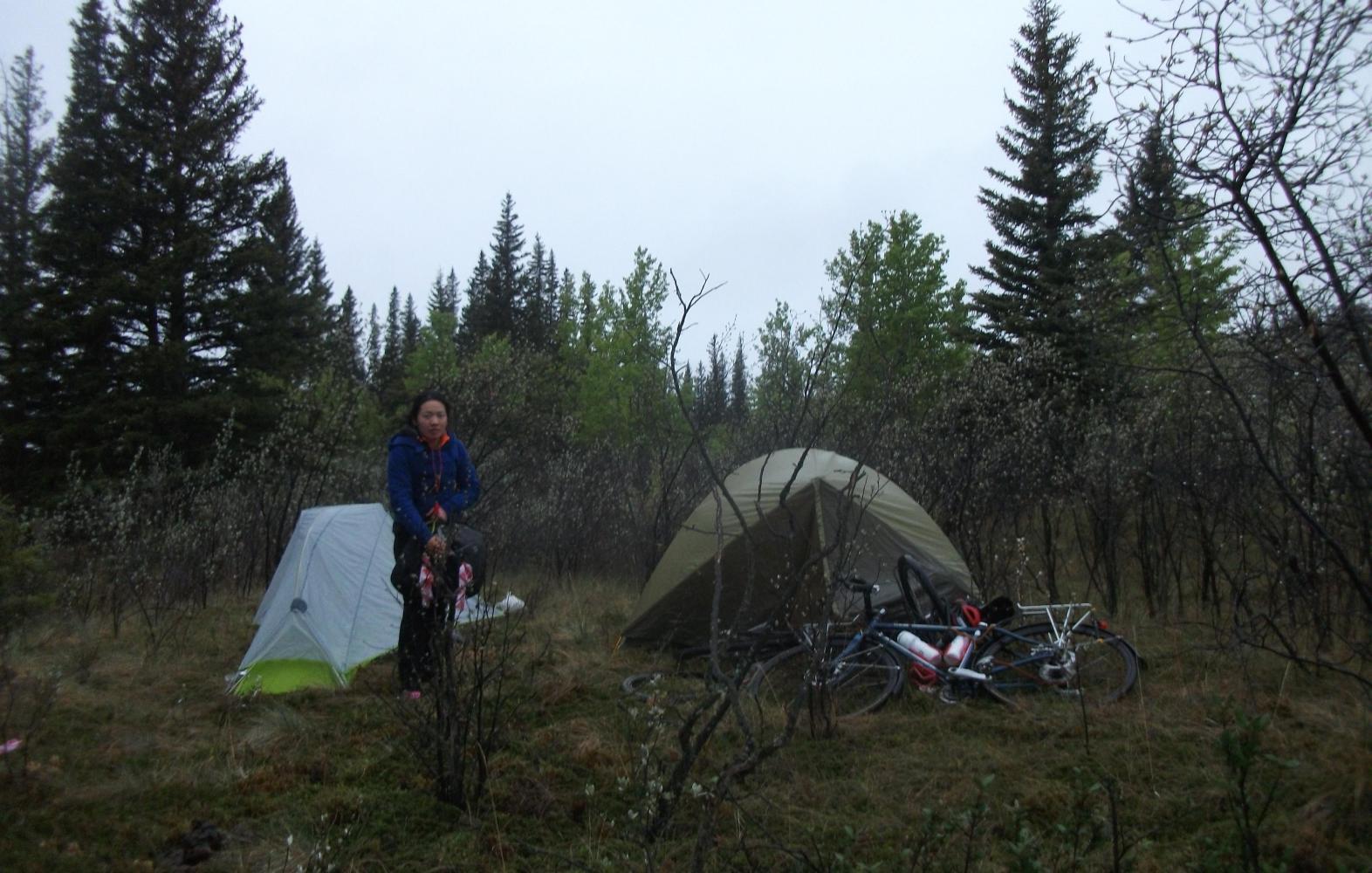 After saying farewell to Vivian I went to the library and wrote for quite a while, then to the supermarket. We had arrived in Cochrane at 9:30 am, but it was after five in the evening when I finally left the town behind. I was pedalling south now on the 22 highway, but it was hilly, and busy, and it was spitting with rain. These things only got worse as I went on, and with fences and empty fields everywhere I wasn’t about to pass up on a chance to camp when I did see one. A section of absent fence invited me to push through a small forest next to a fast-flowing gritty river. This little valley was almost ideal, although I did see quite a number of animal tracks in the sandy ground near to where I pitched my tent. There were some hoof marks, probably from deer, and some paw prints. Coyotes or wolves most likely. No obvious bear tracks at least. Vivian would have loved it.