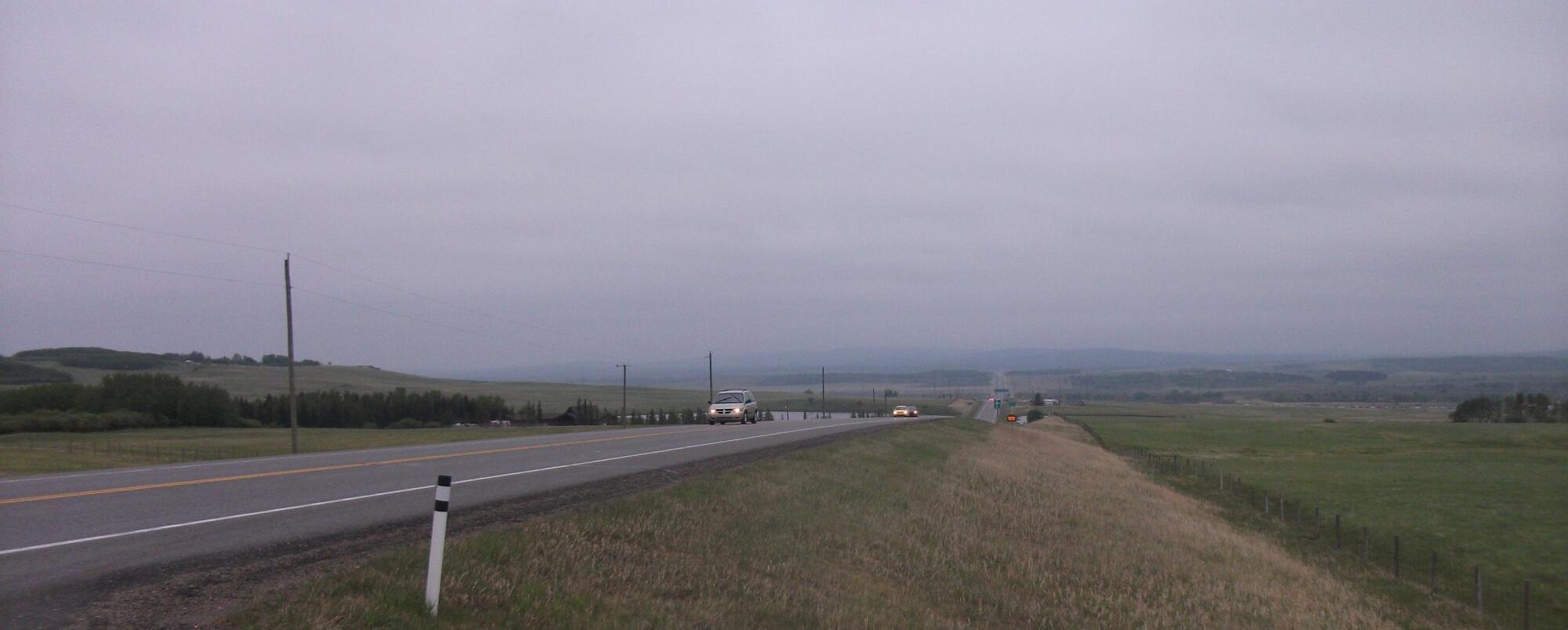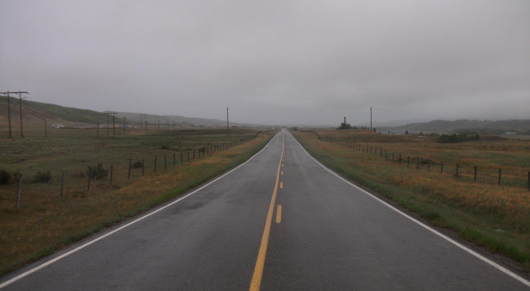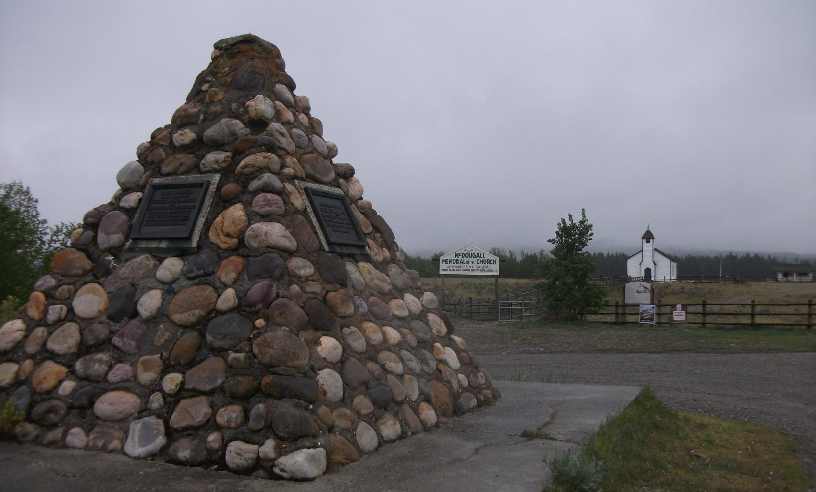 It was another cold, cold night, and a cold, slightly wet morning too. Miserable weather, and the kind of weather that gave Vivian an extraordinary zeal and focus. Nothing motivated her to cycle more than the thought of getting somewhere warm and indoors. So we got up early again and set our sights firmly on the town of Cochrane. We only stopped once en route, at an old church (I use the term ‘old’ in the Canadian sense, of course) where information boards told us of the pioneering good that priests did here, in bashing the savageness out of the savage first nations with their bibles. We didn’t go in, because like everything else in Canada in May, it was closed for the season, but we sat on a wall outside next to a pyramid of rocks and ate breakfast. Vivian spotted another wolf/coyote wandering across the fields, and Cochrane became an even more attractive prospect.