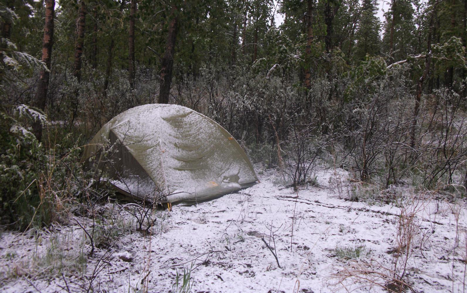 All night long the pitter patter of rain fell upon my tent. I didn’t want to get out of my sleeping bag in the morning. To put my already wet clothes back on and go out into the rain again was utterly unappealing. So I just lay there and listened to the rain until eventually it stopped. Relieved, I stuck my head out of the tent, only to discover that the reason that I could no longer hear the rain was because it had started to snow. I closed the tent and curled back up in my warmish sleeping bag.