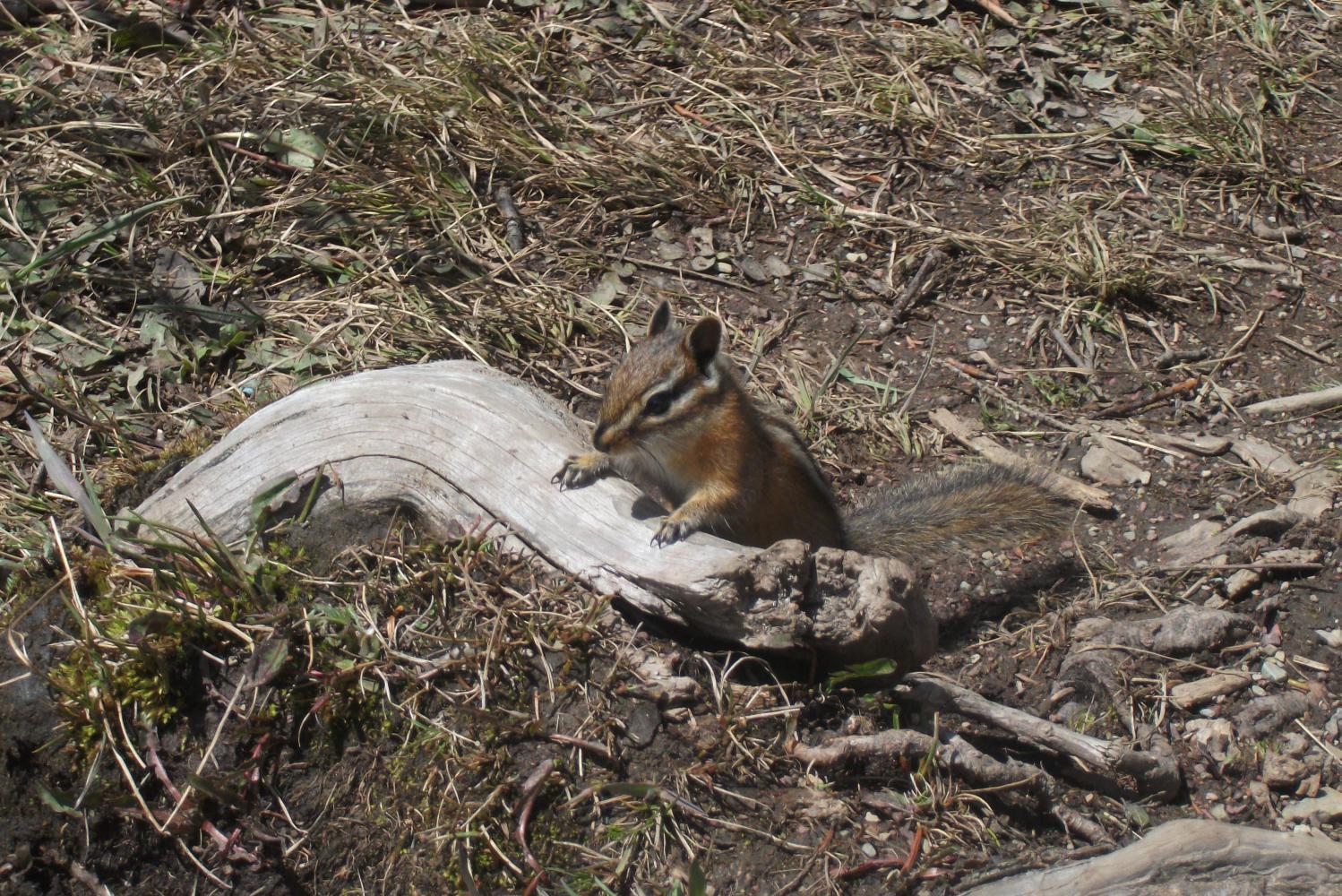 I tried to walk around the lake but I was soon beaten back by snow still several feet deep, and so I settled for sitting on some rocks beside the water and admiring it. As I was doing so I noticed more chipmunks darting about amongst the rocks and I set to the task of getting a good photo of one of them. They were very entertaining little creatures to watch and I easily spent half an hour doing so.