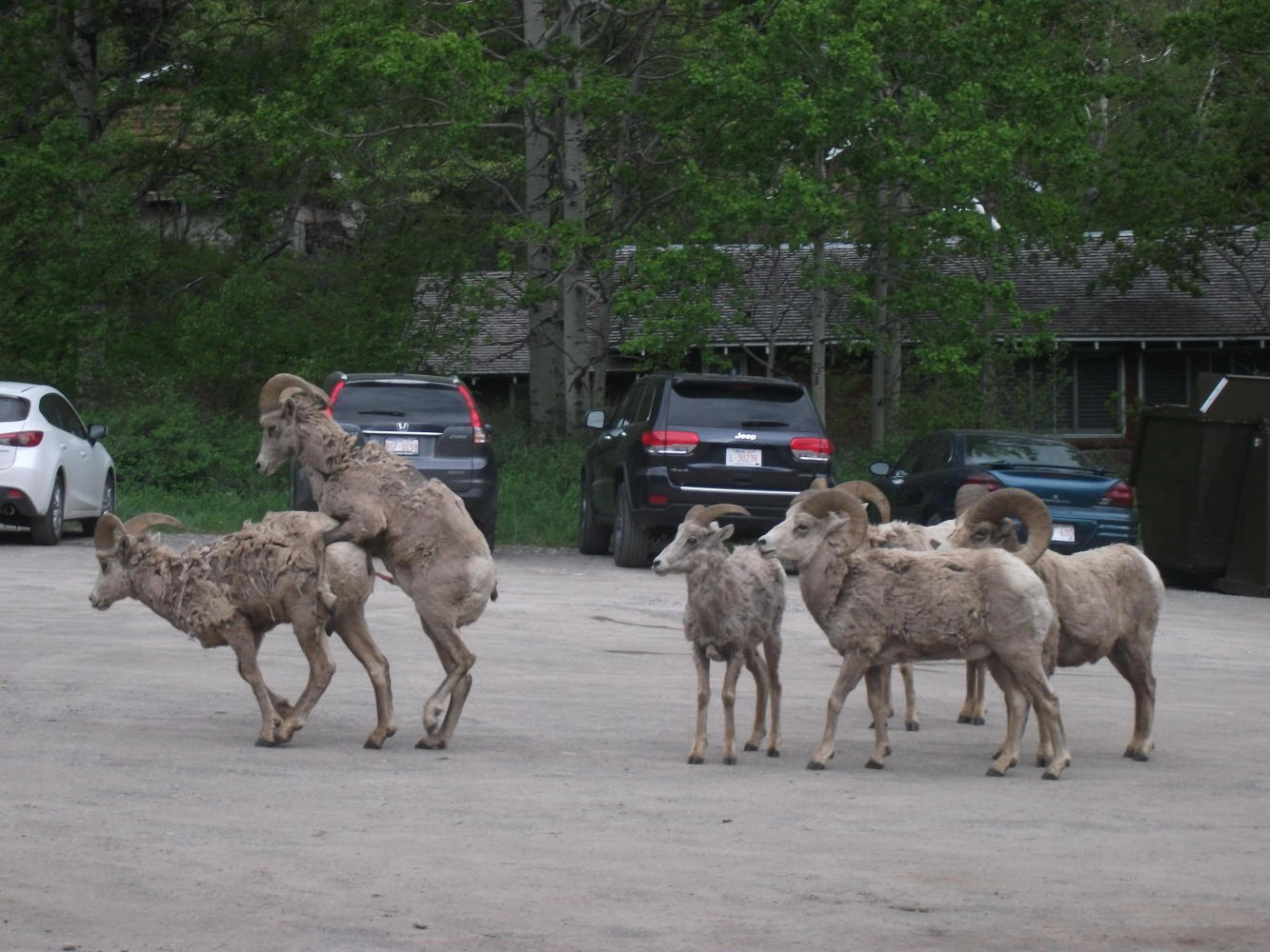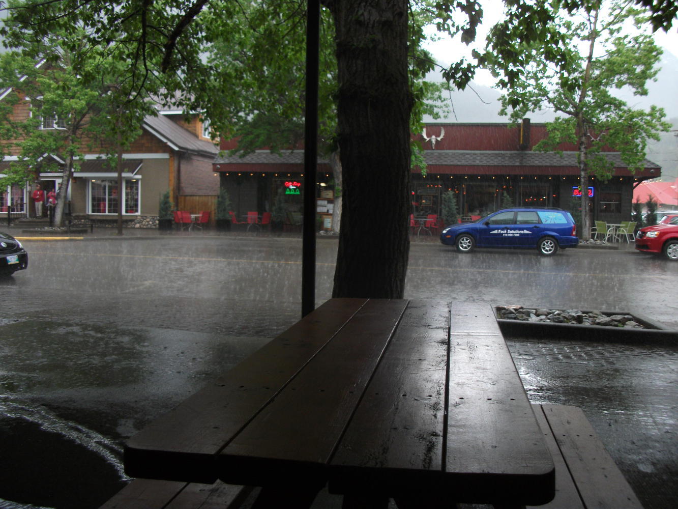 I reached my bike and hurried to unlock it and get into the village, pausing only to admire some bighorn sheep in the car park. I'd also seen some in the village earlier and these were clearly animals that had adapted, much like the chipmunk earlier, to coexist quite happily with humans. But there was no time to waste, the rain was on its way any minute. I cycled into the centre of Waterton and rushed to find somewhere to shelter. To my great annoyance a friendly man saw me and said “Hey, where are you from?” as if he wanted to stop and chat in the middle of the street. Were people really so unaware of the weather, how it changed, what was about to happen? Or had I just become super-aware of it after spending the last six years outside? Either way I wasn't stopping, not there, so I said “England” and I carried right on going. I soon found what I was looking for, a sheltered area with benches, and I made myself comfortable just as the deluge began.