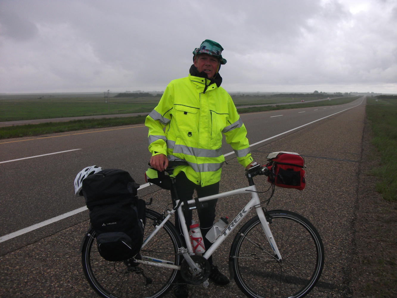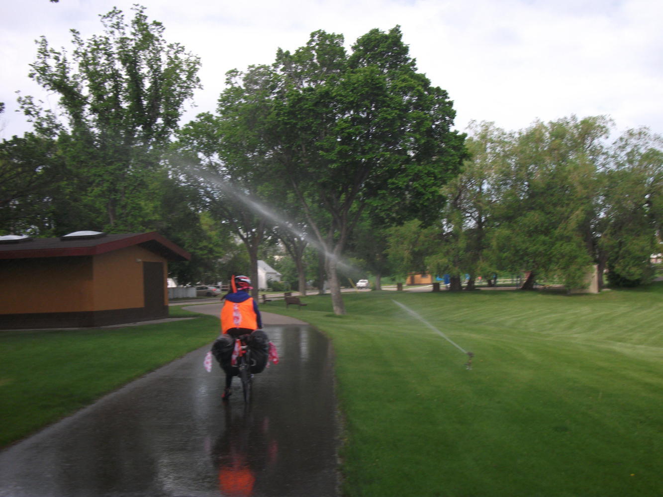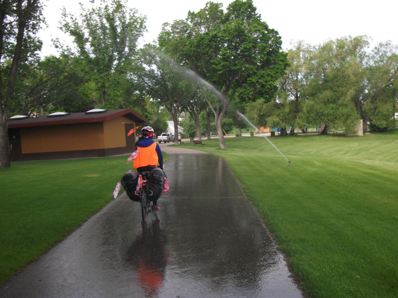 We left our kind hosts in Swift Current, with me resolving to buy my own kids a trampoline someday, and headed off to continue our long ride across the prairies. At least we had a bike path for a few kilometers through Swift Current before the monotony would resume. Through one park this took us past a sprinkler that had been set up to soak any cyclist that wasn’t able to time their sprint through the gauntlet well. Cyclists, such as, for example, Vivian.