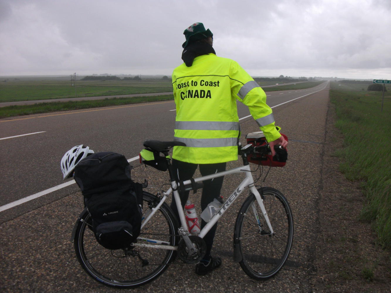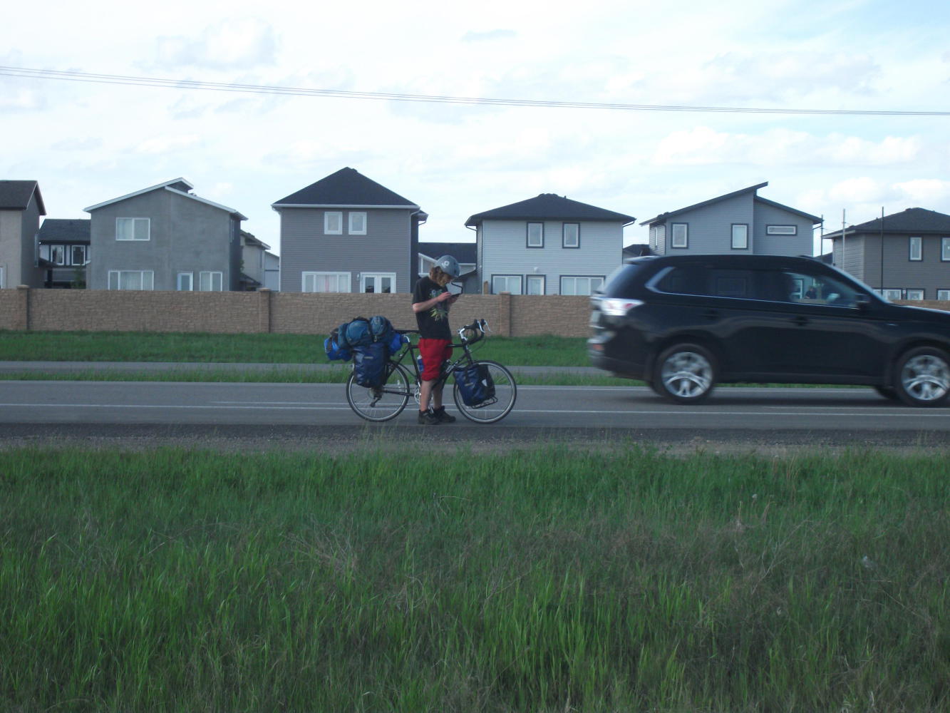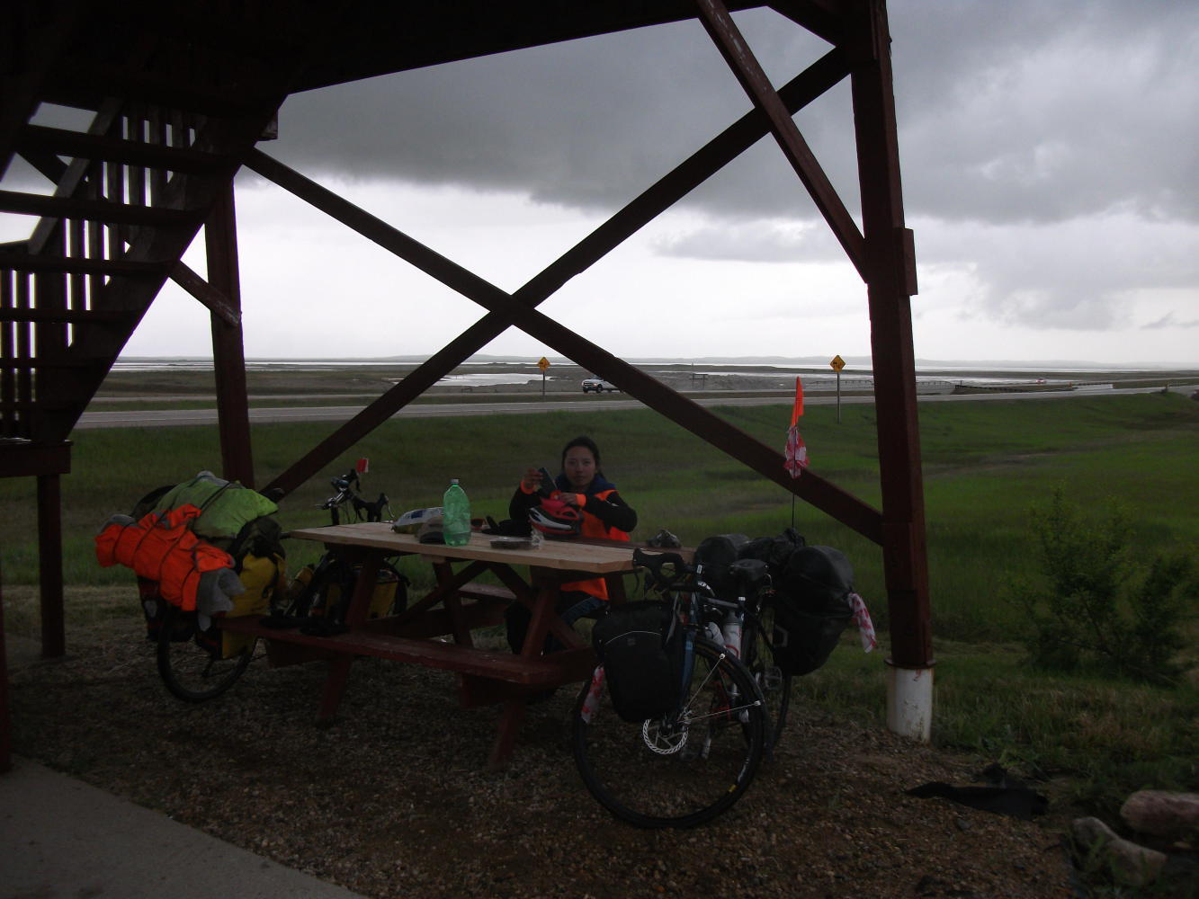 We left our kind hosts in Swift Current, with me resolving to buy my own kids a trampoline someday, and headed off to continue our long ride across the prairies. At least we had a bike path for a few kilometers through Swift Current before the monotony would resume. Through one park this took us past a sprinkler that had been set up to soak any cyclist that wasn’t able to time their sprint through the gauntlet well. Cyclists, such as, for example, Vivian.