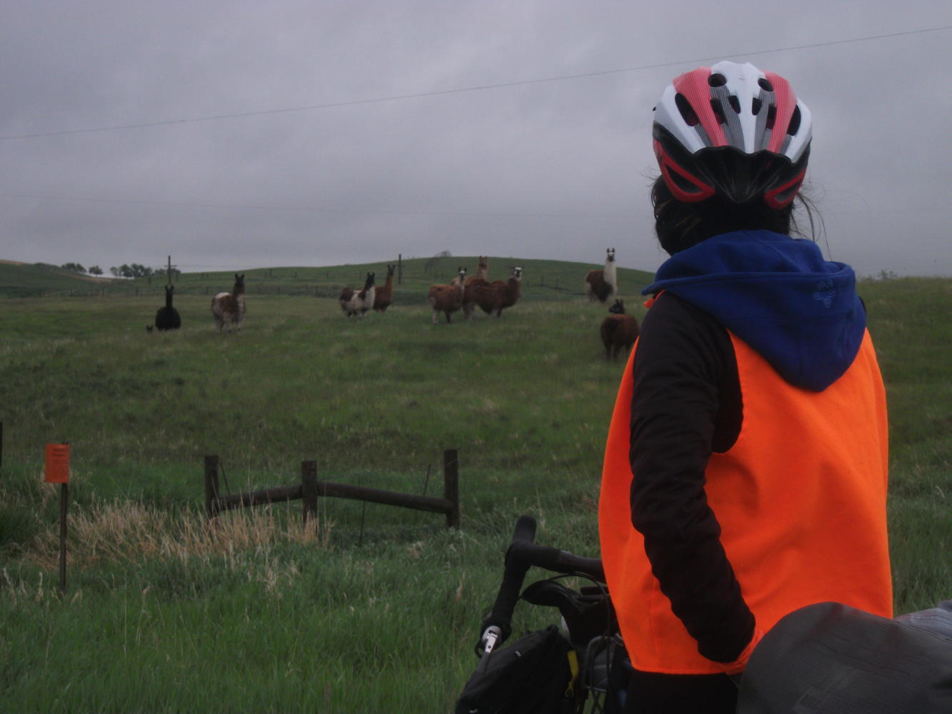 This wasn’t the only time Vivian got wet, however. After a morning of tailwind the weather turned against us for the first time, with dark skies, a little rain, and a frustrating headwind. This less pleasant weather continued on and off for the next day, somewhat seeping morale. I tried to keep Vivian’s spirits up by riding next to her and playing Twenty Questions. It’s a pretty basic game, I’d think of a celebrity and she’d have twenty yes/no questions to work out who it could be. For example I thought of George W. Bush, and she asked a load of questions, and then guessed that I was thinking of the skateboarder Tony Hawk. “Close Vivian, very close.”