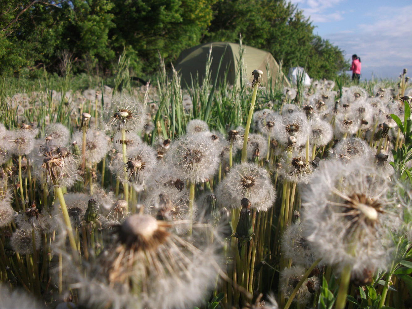 In the intervening days we just cycled. Our grey highway continued stretching like a ribbon across an endless sea of green fields. I continued to listen to my TV series, and when I’d listened to them all I began again from the first one. Vivian and I were getting on surprisingly well, although not really well enough to spend the whole day chatting. She’d downloaded herself some music and was happy enough with that, especially as the weather improved again. In the evenings we camped together, in occasional patches of trees or fields of dandelions. And each morning Vivian would return to the road, look left, look right, look confused, and then about 50% of the time, start cycling in the wrong direction.